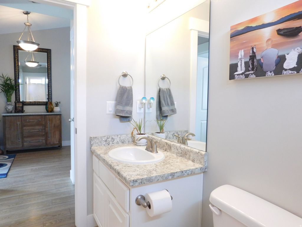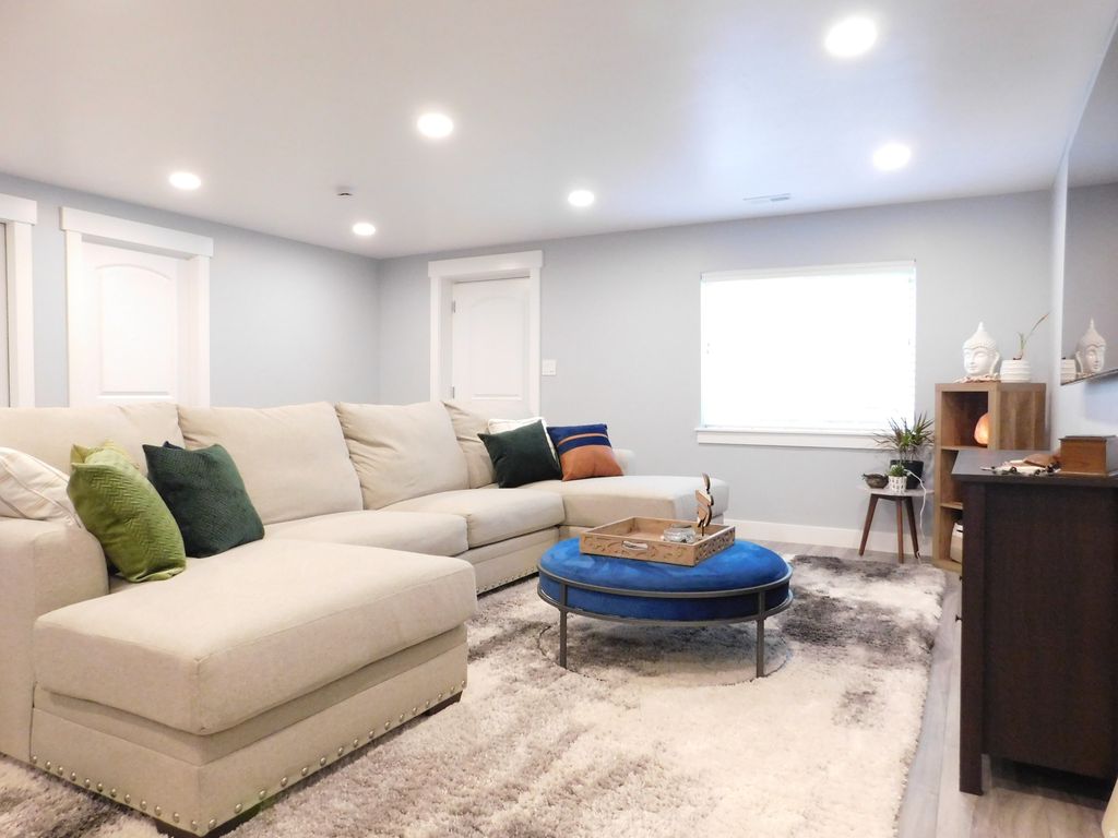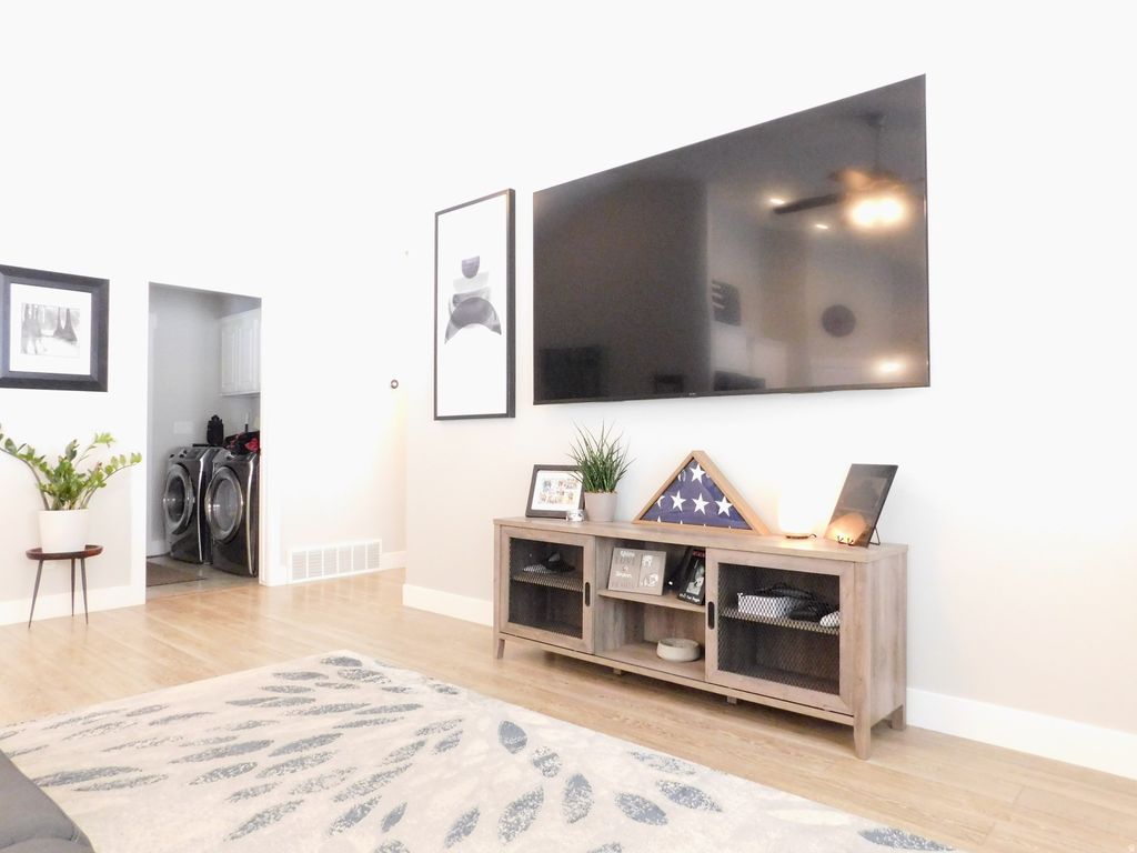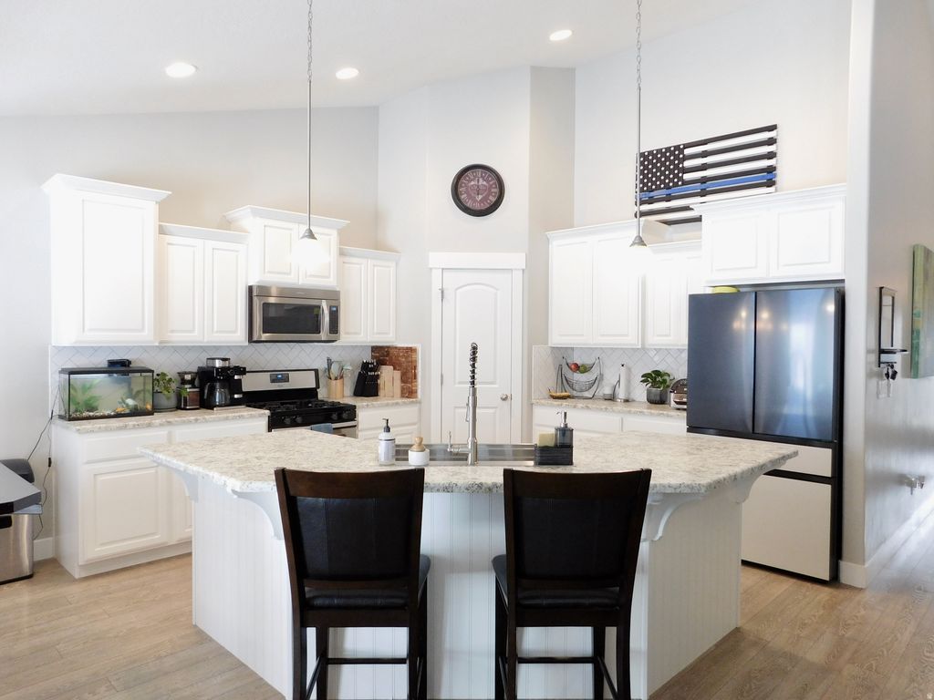 Beautiful rambler-style home offering 3,114 sq ft, 5 bedrooms, and 3 bathrooms with comfortable main-level living and a spacious open layout. The home features vaulted ceilings, waterproof LVP flooring, and a stunning kitchen with a large island bar, white staggered and stacked cabinetry, and plenty of space for gathering and entertaining. The primary suite is generously sized and includes an ensuite bath with dual vanity sinks and walk-in closet. Downstairs, the expansive walk-out basement provides incredible flexibility with plenty of space for a future full kitchen or wet bar, making it ideal for entertaining, guests, or multi-generational living. Step outside to an intimate, low-maintenance backyard featuring an extended patio and decorative lighting, perfect for relaxing or hosting friends and family. The home is clean, well-maintained, and located in a community with a low HOA and permitted off-street parking.