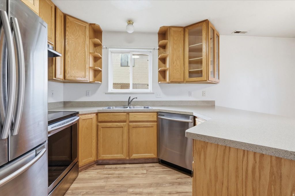 Affordable and centrally located townhome in Meadow Village! This end-unit offers 2 bedrooms, 1.5 bathrooms, and 1,044 sq ft of great living space. Main level features a spacious living area, functional kitchen with peninsula seating, and convenient half bath. Upstairs you'll find two generously sized bedrooms and a full bathroom. Private patio space, covered carport parking, and additional uncovered parking. Full landscaping is maintained, and the HOA covers maintenance and snow removal for easy living. Built in 1995 and situated in a well-established Logan neighborhood close to schools, parks, shopping, and USU. Whether you're a first-time buyer, investor, or looking to simplify, this is a great opportunity at an attractive price point.
