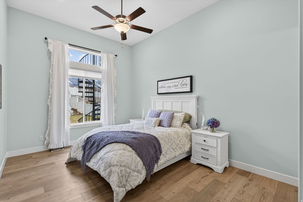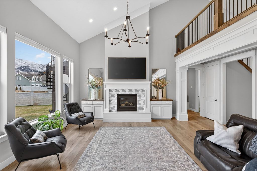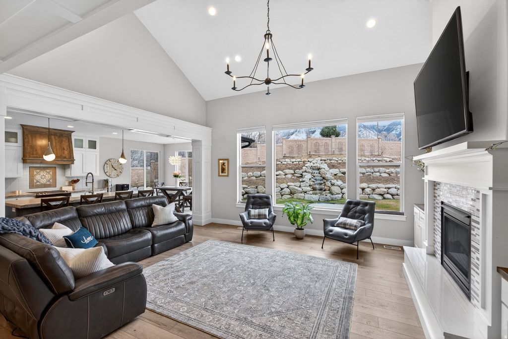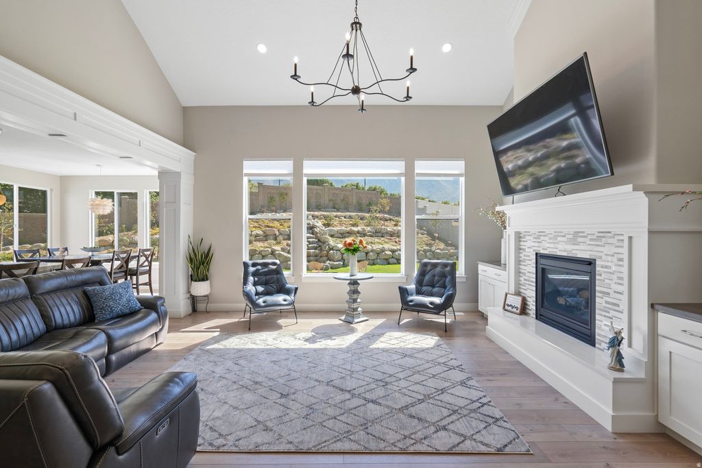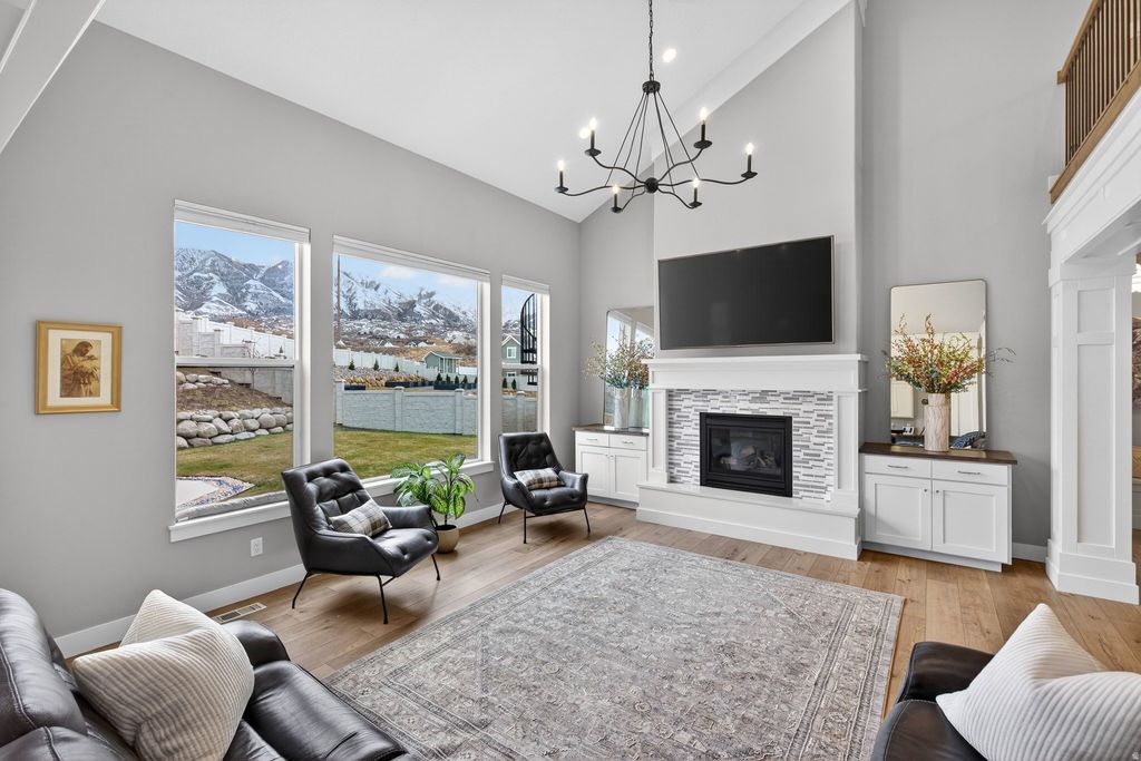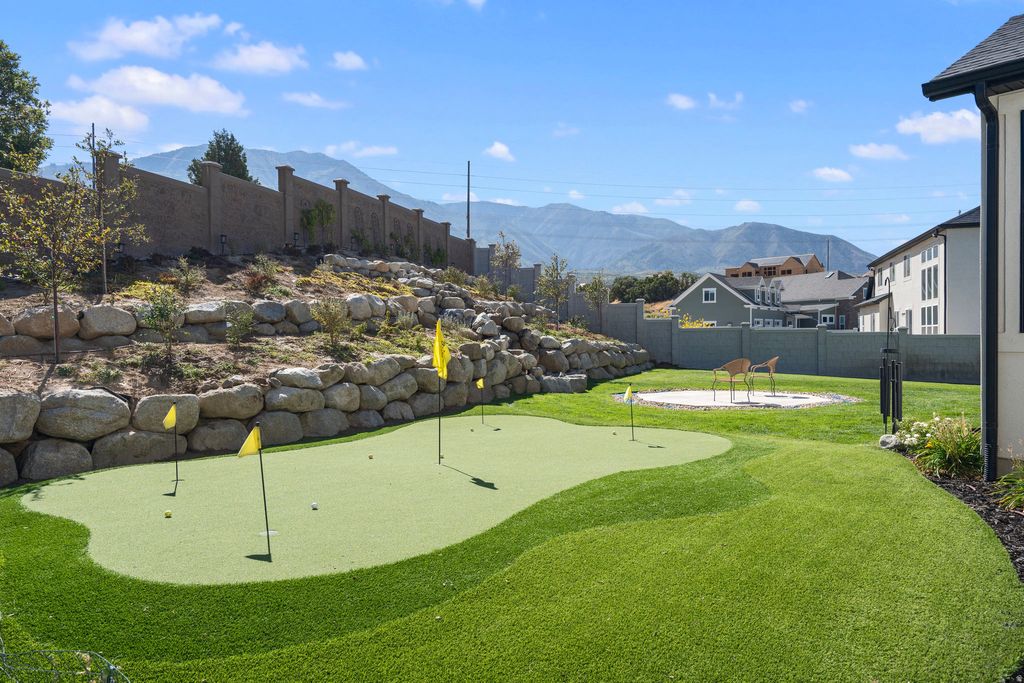 JUST LISTED! Come for the views-stay for the extras! Nestled in a quiet double cul-de-sac at the base of the Nebo Mountain Range, this French provincial-style home has it all: stunning mountain views, a large, manicured lot, an extra 3rd car garage, a huge RV pad, a winter greenhouse, a putting green, a 15 ft. waterfall, and an observation deck to enjoy it all. The interior features a 2-story great room with XL windows to capture the mountain and waterfall views. The master bedroom boasts 14 ft. ceilings and two large walk-in closets (his + hers) with stackable W/D and double vanities in the grand master bath. Also on the main floor are a spacious, private office, a second office or craft room, and a walk-in pantry in the bright, open kitchen. Upstairs, you'll find 3 bedrooms, a full bath, and a second laundry setup. In the unfinished basement, there's space for 3 more bedrooms, a full bath, and a large family room. Sellers finished an attic room to use as a sauna + yoga room, but it could also serve as an office, additional storage, or a home gym. Come see this beautiful home for yourself! ( *More pics of master bath, second walk-in closet, and finished attic room coming soon* )
