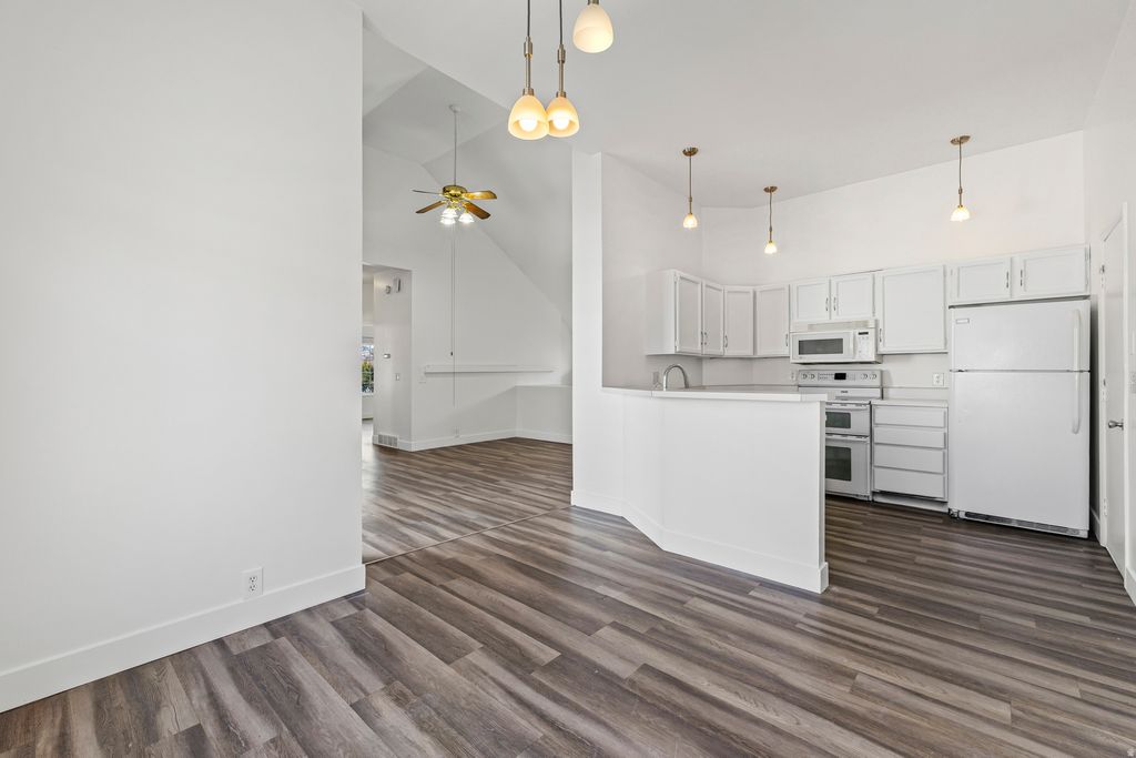 Beautiful open-concept contemporary condo featuring 2 spacious bedrooms and 2 full bathrooms with a thoughtfully designed and inviting floor plan. This unique residence offers single-level living with no shared walls, vaulted ceilings, abundant natural light, and an impressive floor-to-ceiling fireplace that creates a warm and welcoming atmosphere. A rounded staircase with elegant metal railing adds architectural charm and character. The kitchen is both stylish and functional, showcasing updated cabinetry, tile flooring in the kitchen and dining areas, a double oven, and included refrigerator-perfect for everyday living and entertaining. A dedicated office nook provides a comfortable space for working from home. Step outside to your private balcony and enjoy the convenience of a single-car garage plus ample guest parking. The beautifully maintained community offers resort-style amenities including two swimming pools, hot tub, basketball, tennis and racquetball courts, a fully equipped fitness center, clubhouse with wet bar and dining area, covered patio with picnic tables, as well as pool table, ping pong, and foosball. HOA covers basic cable, water, sewer, garbage, snow removal, and exterior maintenance for easy, low-maintenance living. Ideally located just minutes from Jordan River Trails and parks, with quick access to I15, I215, Redwood Road, shopping, dining, and entertainment. A must-see property that truly stands out-schedule your showing today!