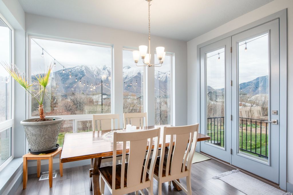 Exceptional custom-built two-story home in the prestigious Sunrise Ranch community, set on a rare 1.14-acre lot with unobstructed mountain and valley views. Widely regarded as one of the finest view lots in the area, the property is thoughtfully positioned to preserve sightlines and privacy. Expansive wall-to-wall windows across the main living areas frame the landscape and flood the home with natural light. Built in 2023, the residence offers 4,970 square feet of fully finished living space with 7 bedrooms and 4.5 bathrooms, designed for both elegant entertaining and everyday comfort. The flexible layout spans all levels and includes a fully finished basement with a separate entrance, ideal for hosting, multi-generational living, or future adaptability. Modern infrastructure includes CAT-6 wiring and smart home features throughout, a high-end whole-home sound system, and mini-split systems in the upstairs bedrooms for individually controlled comfort. The 3-car garage and shop are equipped with additional 220V power suitable for shop use or EV charging, along with heavy-duty storage racks and compressed air lines, with infrastructure in place for future shop heating. Outdoor living is elevated by the scale and privacy of the lot, while JellyFish programmable exterior lighting adds year-round ambiance and curb appeal. Located in the Nebo School District and just minutes from recreation, trails, and town amenities, this property offers a rare combination of protected views, privacy, and refined modern living.