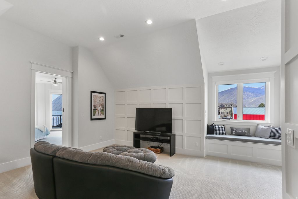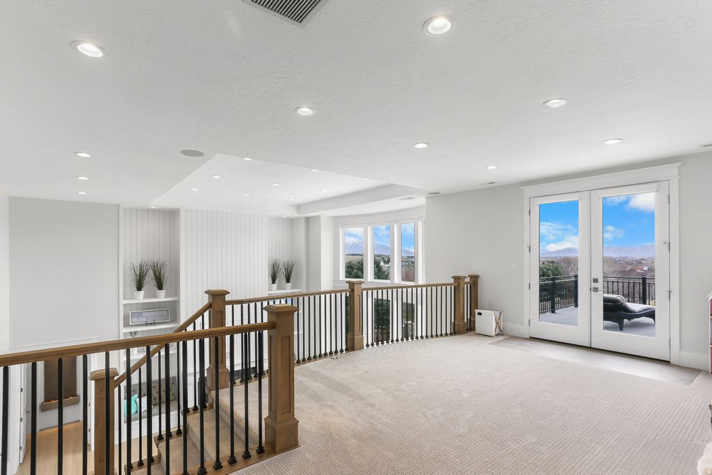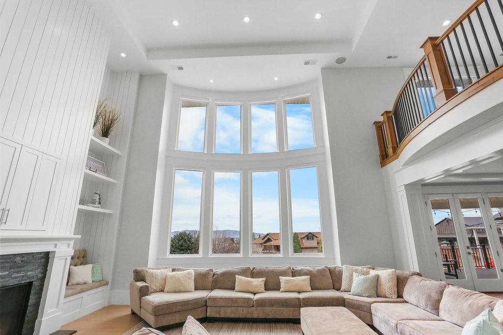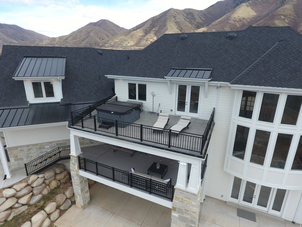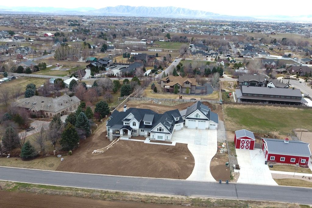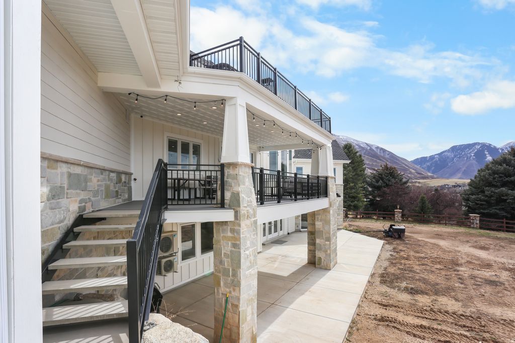 Nestled in a private, exclusive area of southeast Mapleton, this exceptional custom home was thoughtfully designed to capture stunning views of Mapleton's mountains and valley. Built with a ton of attention to detail, the home features spray-foam insulation, high-efficiency systems, Andersen composite double-pane casement windows throughout, 70 solar panels, Presidential asphalt shingles, 32 security cameras, remote blinds on all windows, built in speaker systems in select rooms throughout house. This home features 10-foot ceilings and a luxurious circular-design master suite with a sound-insulated bedroom, bay window sitting area, private deck, and a spa-style bathroom with dual floating vanities, two sinks, and expansive walk-in closets. A laundry stack in the master suite also adds convenience The home offers multiple climate zones with clean airflow in mind. Upstairs includes an additional 2 bedroom suites, each including spacious closets and a full bath with guest lounge area in between. Basement has a theater room with audio/video closet, wet bar, a connected room below master suite, and a gym room with exterior access + a built-in wet sauna and shower. There is a massive cold storage room and underground passage to 2,551 sq ft of additional unfinished flex/storage/shop space, with small garage-door access to the backyard. Exterior RV garage has two 14-foot doors and space for two RVs with hookups, plus a 1,200 sq ft apartment above with 2 bedrooms, full bath, kitchen, and laundry. Plans for a future pool and landscaping have already been completed. Schedule to see this home today!