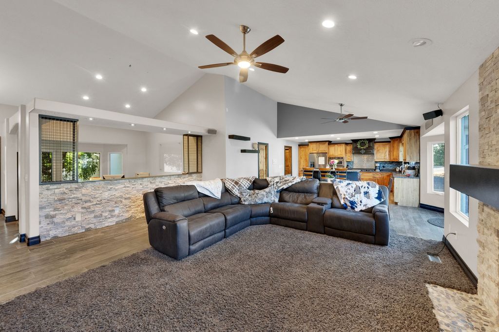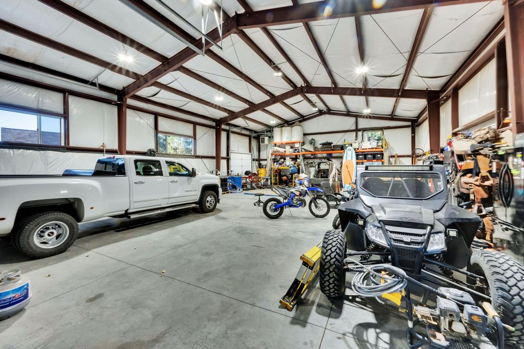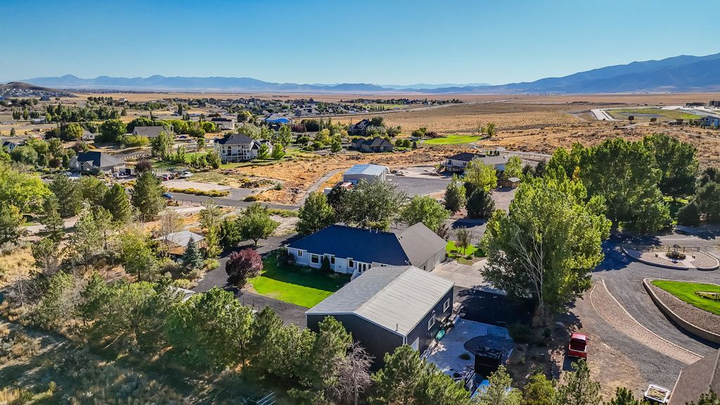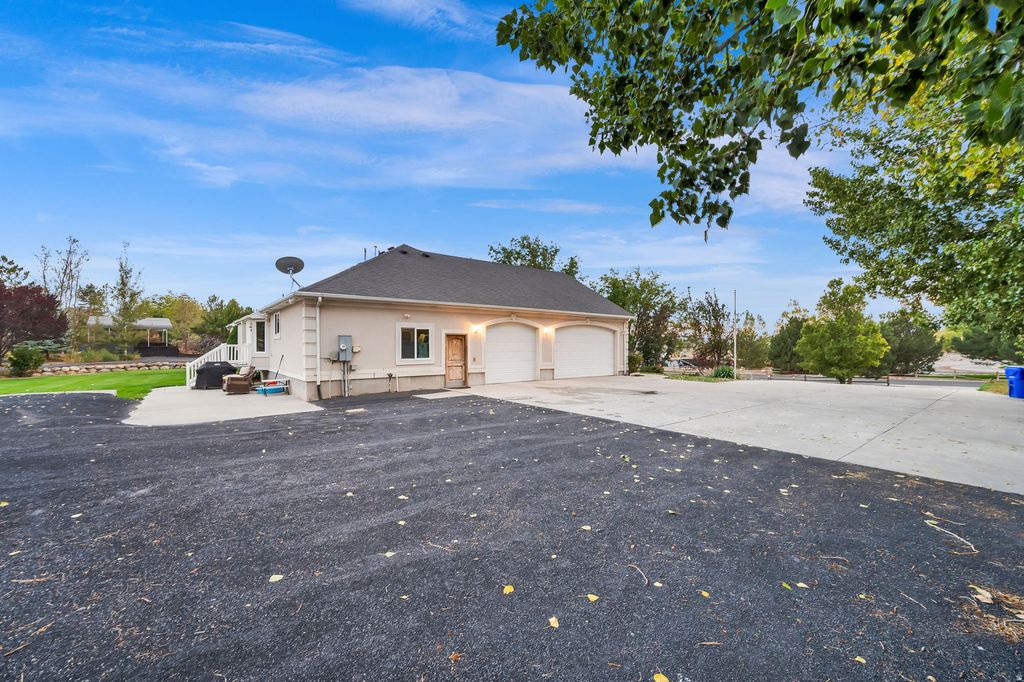 MASSIVE 40'x60' HEATED SHOP + STUNNING 6BD/4BA RAMBLER + HORSE PROPERTY ON 1.31 ACRES! Bring the horses, the RVs, the toys - and your BIG dreams. This beautifully landscaped estate blends country charm with modern luxury, featuring mature pines, fruit trees, vibrant gardens, and even an underground root cellar. The showstopper? A 40'x60' heated shop with 16'x14' doors - fits up to 8 cars or 2 full-size RVs - with RV power inside & out and parking for 10+ more vehicles. Plus an oversized 3-car garage and three 24'x12' horse stalls. Inside, vaulted ceilings and a grand foyer lead to an open great room with gas fireplace and a chef's kitchen boasting granite countertops, custom cabinetry, gas cooktop, wall oven, and oversized island. The private owner's suite offers a jetted tub, custom shower, dual vanities, and walk-in closet. The walk-out basement expands your living space with a massive family room, built-ins, 3 additional bedrooms, full bath, study area, and mirrored gym. Major upgrades include central air, central vac, new water heaters, newer furnace & A/C. Propane heat and private septic complete this rare opportunity. THIS HOME HAS IT ALL! Eagle Mountain City does allow for an ADU on the property.
