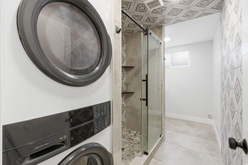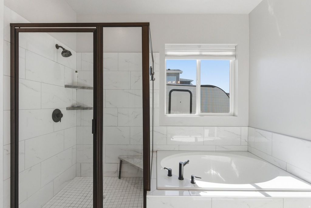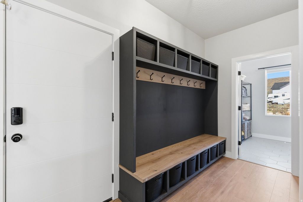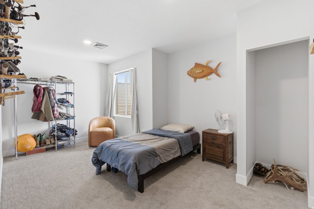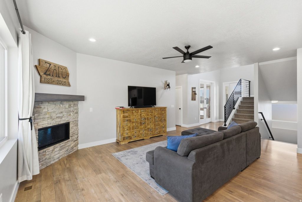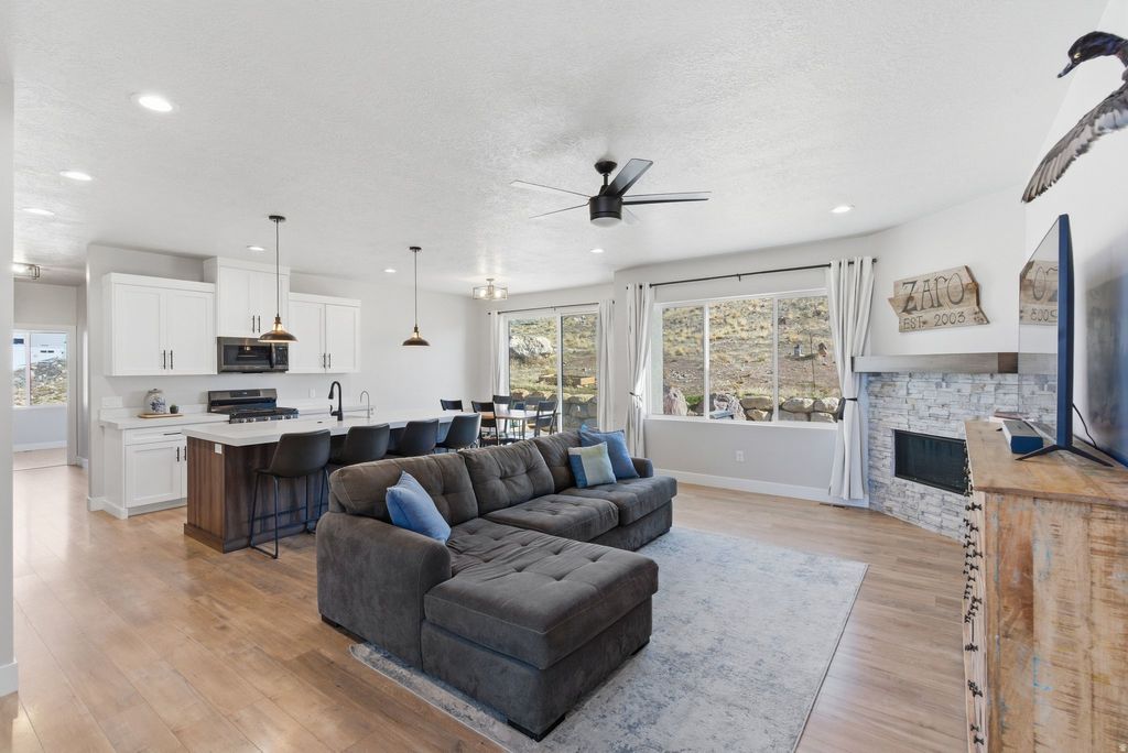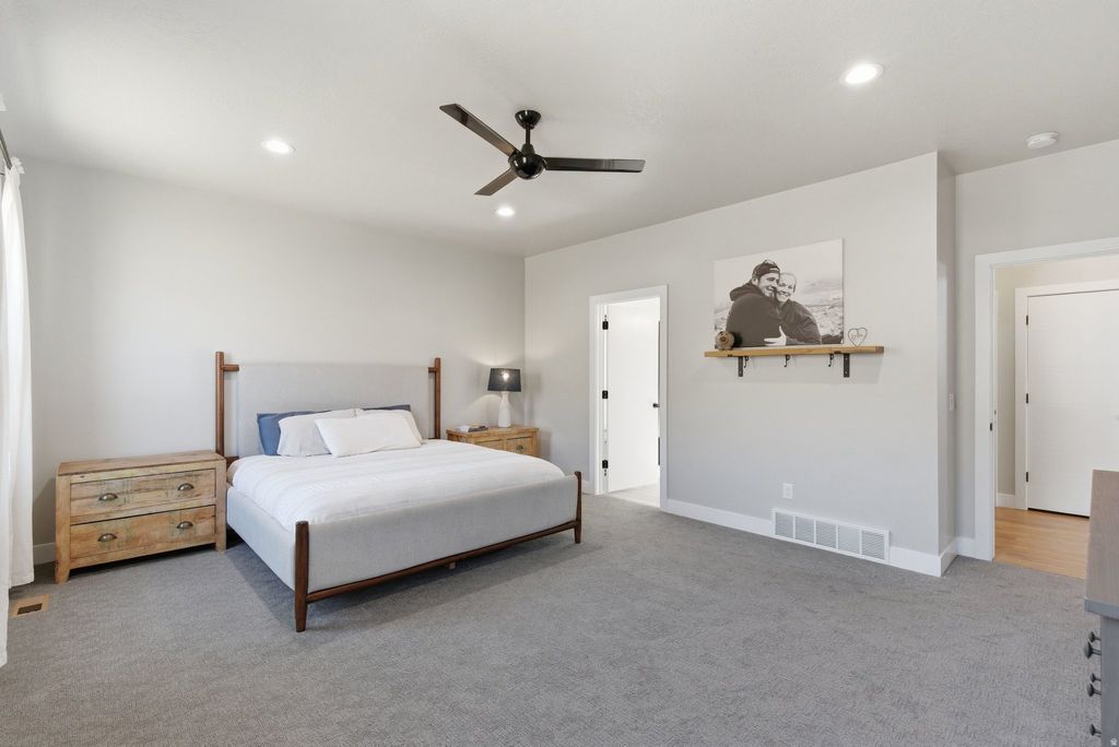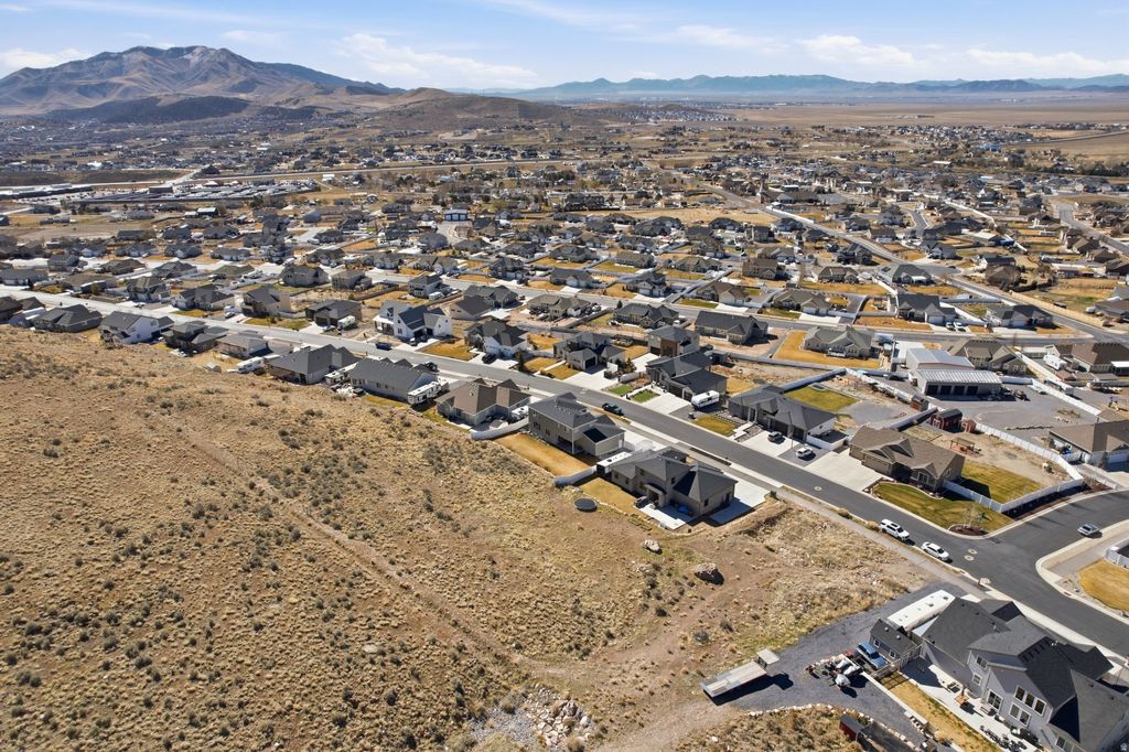 Experience mountain modern elegance in this hillside home by Argyle Homes, featuring breathtaking mountain and lake views and numerous high-end upgrades. Nestled against a hillside, the property offers ultimate privacy with no backyard neighbors. The yard is fully irrigated and thoughtfully designed with a second flat level, perfect for adding a pool, expanding the yard, or creating space for horses or other livestock. The private backyard features a large extended concrete patio with a built-in granite BBQ, creating the perfect space for outdoor entertaining, dining, and gatherings with family and friends. This property offers exceptional parking with space for large RVs and additional vehicles. One side features a 35-foot gravel space with full RV hookup, while the other side has a 40-foot cement pad, providing ample parking for all your toys and guests. Inside, oversized windows fill the home with natural light and showcase the stunning views of the mountains and lake. The kitchen is a chef's dream, boasting a massive island, abundant soft-close cabinetry, and ample storage. A large walk-in pantry provides even more space for kitchen essentials, while the generous dining area easily accommodates a very large table-perfect for family meals or entertaining guests. The main-floor primary suite includes a soaking tub, dual sinks, and a separate shower, with laundry conveniently located on both the main level and basement. The basement features soaring 9-foot ceilings and luxury vinyl plank flooring throughout. It offers a spacious entertaining area, a stylish bathroom with an adjoining laundry space, ample storage, and a mechanical room with a water softener-combining practicality with comfortable, versatile living. With stunning views, generous yard space, full irrigation, and exceptional parking, this home offers a rare combination of modern elegance, functionality, and privacy. Included appliances: two washers, two dryers, and the refrigerator, providing convenience and move-in ready functionality. All information should be independently verified by the Buyer. The current owner has had the home professionally tested and cleared for both meth and radon; copies of the reports are attached for review.