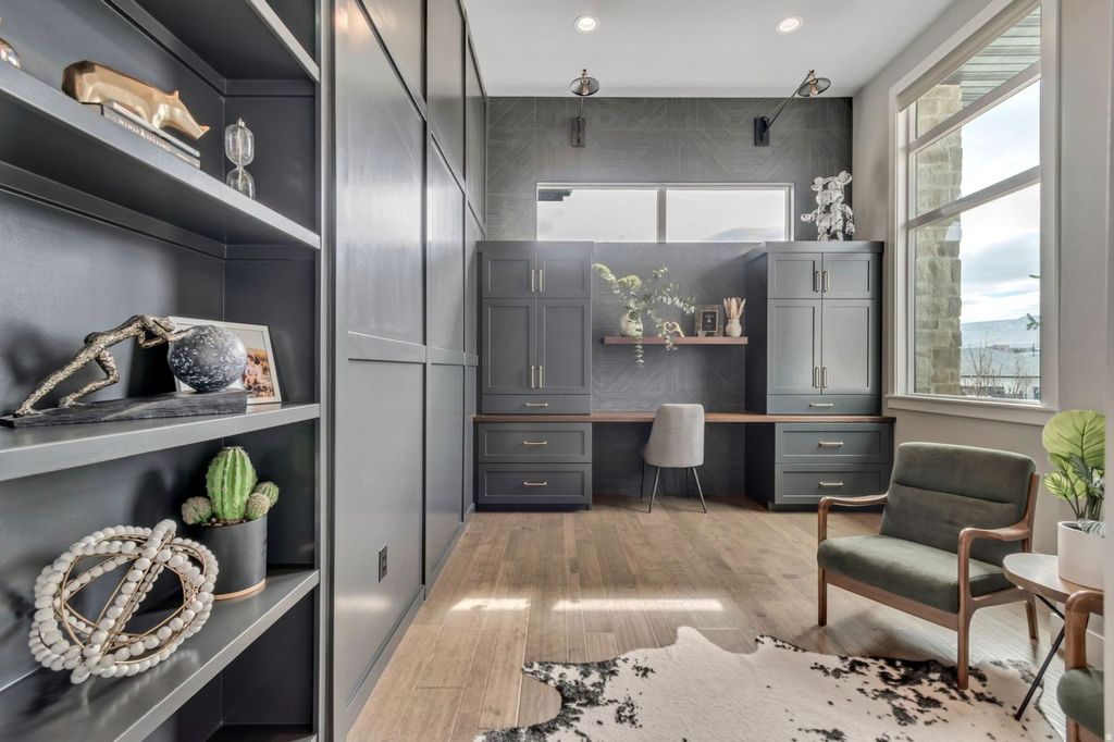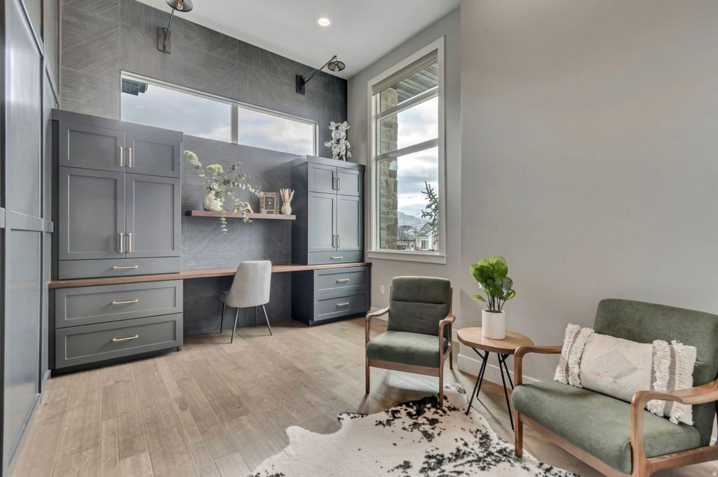 This parade home award winner is a must see! Newly added cabinetry to the mudroom and office is ideal for storage. Additional upgrades like inground trampoline, RV pad, basketball hoop, outdoor kitchen, built in gas firepit, water softener, roller shades, and garage shelving. This home is located in a superb community with a park, bike path, and a pool next door to the home. The pool location is so convenient, it makes the summer a blast. This home has a stunning modern exterior with glass panel garage doors. The fully finished 4 car garage (3 car and deep tandem) features ceiling storage and epoxy floors, as well as a 240V outlet. As you walk in you're welcomed by a stunning catwalk with modern railing, open to the great room with a 2 story concrete fireplace. The large den/office has 14' ceilings and beautiful new cabinetry with a fully tiled accent wall. Warm engineered hardwood floors compliment the modern elements perfectly. Massive waterfall island open to the great room provides the perfect entertaining flow. Large pantry and dining nook. The dining nook opens up to the covered patio. The outdoor kitchen is sleek, modern concrete and honed black granite countertops. Off the kitchen is the mudroom with 5 large custom cabinet mudroom lockers. A newly upgraded powder bath features a viola marble sink and tiled walls. The primary suite on the opposite side of the home boasts 10' ceilings, a walk in shower, and large walk in closet. Square footage is pulled from a previous appraisal, buyer to verify.