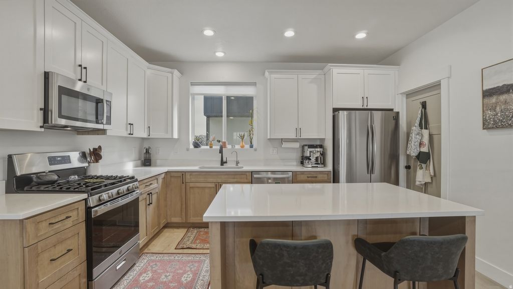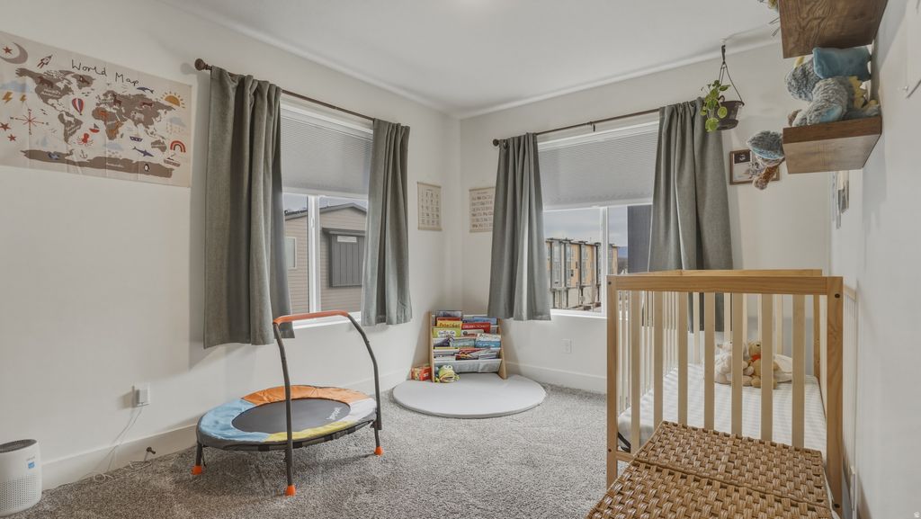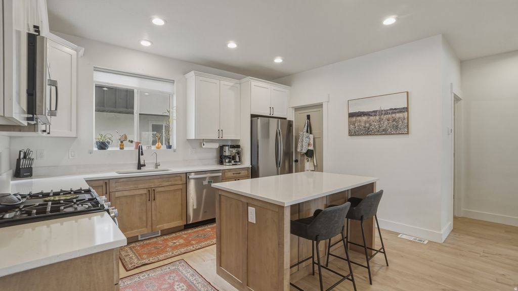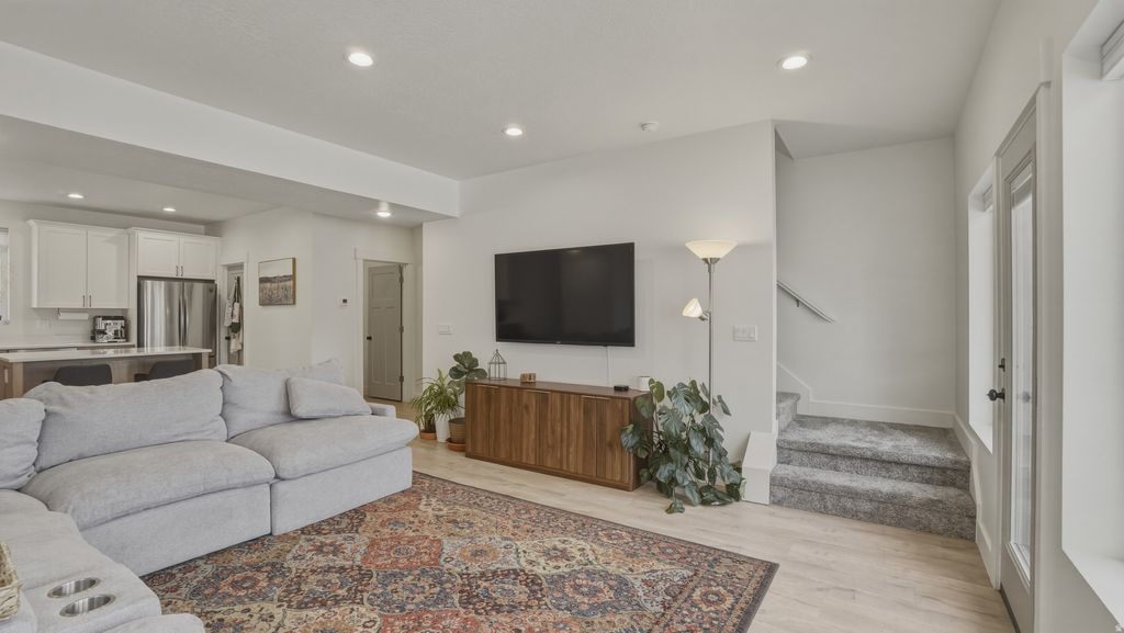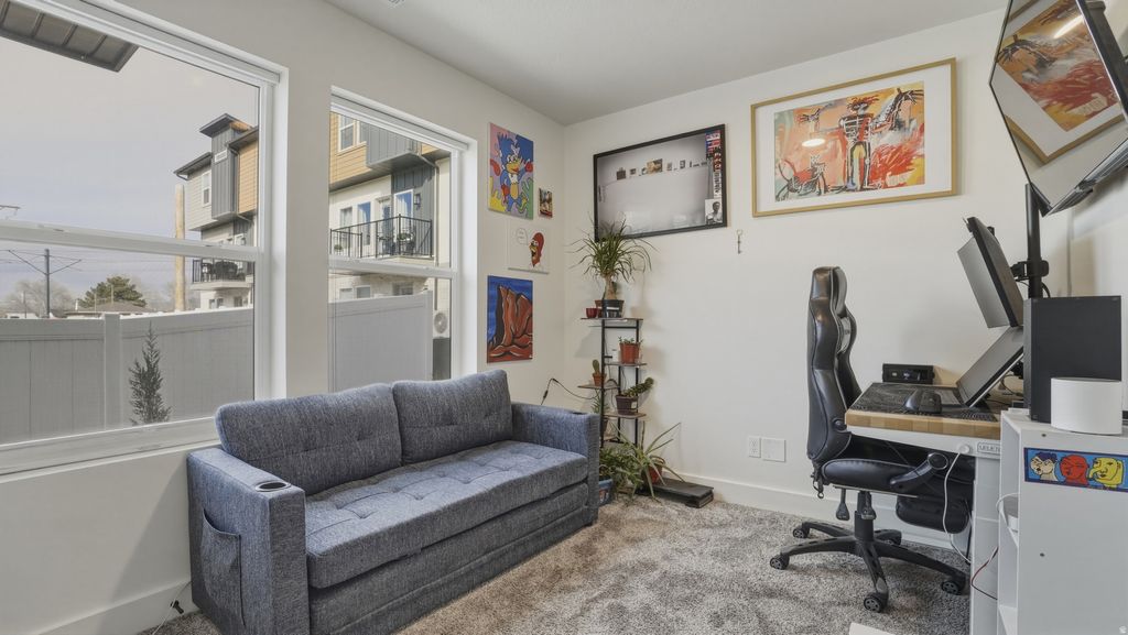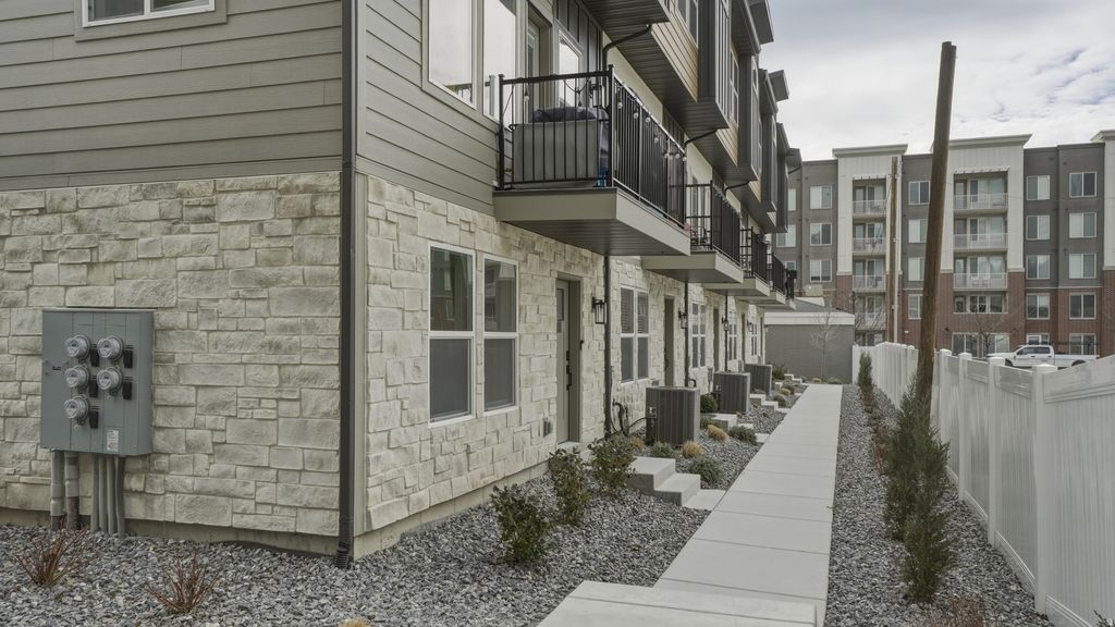 Built in 2024, this light-filled 4-bedroom, 2.5-bath END-unit townhome offers modern design, thoughtful upgrades, and exceptional convenience in the heart of Midvale. Oversized windows flood all three levels with natural light, creating a bright and inviting atmosphere throughout. The open-concept kitchen is ideal for both entertaining and everyday living, featuring a gas range, 42" two-tone cabinetry, 3cm quartz countertops, a large island, and a walk-in pantry. The entire second floor, bathrooms & laundry room showcase durable luxury vinyl plank flooring, complemented by upgraded carpet elsewhere. Enjoy the spacious living room with direct access to a private balcony, complete with a gas line for BBQ. The main-level bedroom offers flexible space perfect for a home office, gym, or media room & includes a dedicated fiber optic line run directly to the garage. HOA-covered fiber internet adds built-in convenience. Upstairs, the primary suite features a walk-in closet, large walk-in shower, double vanity, and upgraded black plumbing fixtures. Two additional bedrooms, a full bath, and a dedicated laundry room complete the upper level. Additional highlights include end-unit privacy with extra natural light, an epoxy-coated 2-car garage floor, smart belt-drive garage door opener with keypad, water recirculation system (no waiting for hot water) & quartz countertops throughout. Enjoy a gated community dog area and an unbeatable location-walking distance to TRAX for easy commuting. Just 2 miles from Gardner Village, Fashion Place Mall, and Bingham Junction (WinCo, Topgolf, and dining), under half a mile to Midvale City Park, and only minutes from historic downtown Midvale. Community qualifies for a 3% down conventional loan with NO mortgage insurance for primary residences. No rental restrictions.