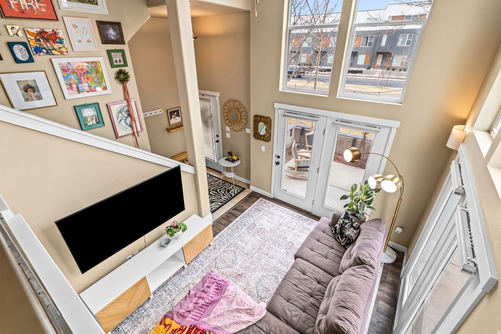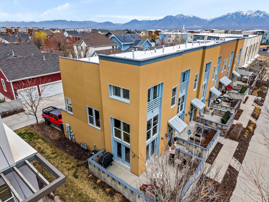 Welcome to elevated living in the heart of Daybreak, equipped with a NEW FURNACE AND AC! Tucked away on a secluded, spacious patio, this beautifully situated townhome offers soaring ceilings and expansive windows that flood the main level with natural light, while automatic blinds effortlessly shade the dramatic ceilings and create the perfect ambiance at any time of day. The primary suite features its own private balcony with serene views, perfect for morning coffee or unwinding in the evening. Enjoy the convenience of walking just two minutes to Harmons and nearby eateries, with Downtown Daybreak and the new Bees Stadium just minutes from your front door, placing entertainment, dining, and community events within easy reach. Experience low-maintenance living paired with resort-style amenities, scenic trails, and vibrant community spaces designed for a lifestyle that feels both relaxed and connected. Buyer is advised to verify all information, including square footage and HOA dues.