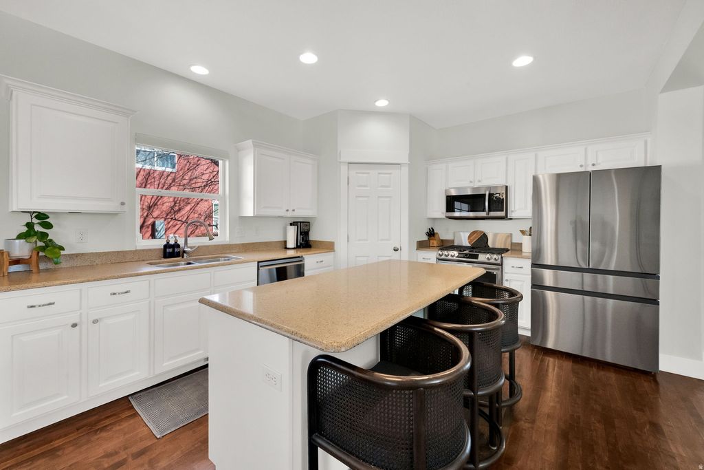 Come home to stylish and comfortable living in this 6 bedroom 4 bath gem. Charming throughout, this was the first home ever occupied in Daybreak! It was paced on the perfect corner .20 acre lot with close proximity to the main community center and Daybreak Elementary. Fully fenced yard showcases many perennials, secluded covered patio and private driveway (trampoline included). Many upgrades within the past 3 years include new roof new exterior paint, lighting and welcoming front door. All new kitchen appliances, new furnace, and central air. Upstairs windows replaced with UV resistant windows. Motorized shades in main living area. Oversized 2 car garage offers extra storage and epoxied floors. Google fiber is available in this area of Daybreak. Huge storage room in 100% finished basement. Pride of ownership on full display!
