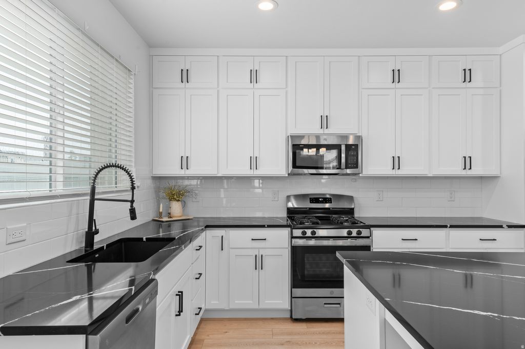 Welcome to this beautifully designed home in the heart of American Fork! Featuring 3 spacious bedrooms, 2.5 baths, and a versatile loft/flex space, this home offers the perfect blend of comfort and functionality. The open-concept main floor is filled with natural light and showcases a stunning kitchen complete with white cabinetry, stainless steel appliances, and a large island with seating. The inviting living area flows seamlessly into the dining space, making it ideal for both everyday living and entertaining. Upstairs, the primary suite offers a relaxing retreat with a private bath and walk-in closet, while the additional bedrooms and loft provide plenty of room for work, play, or guests. Enjoy the fully fenced yard with room to gather and play, plus the convenience of a prime location near schools, shopping, dining, and easy freeway access. Don't miss the opportunity to make this stylish, move-in-ready home yours! Buyer/Broker to verify all information. Seller is related to the listing agent.