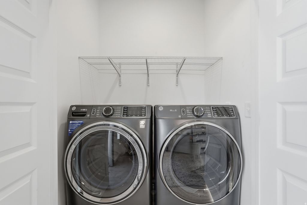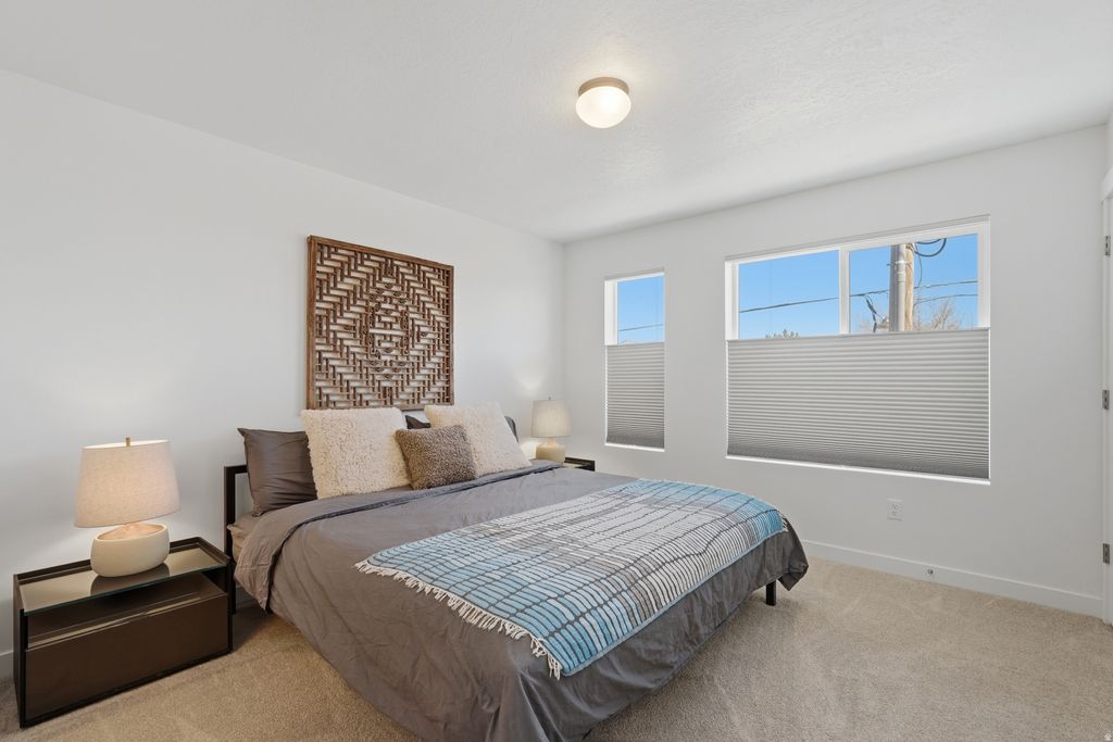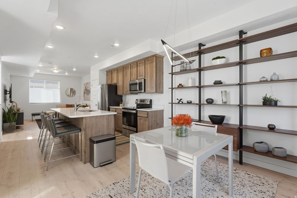 Meticulously maintained and built in 2024, this stunning two-bedroom end-unit townhome offers abundant natural light, enhanced privacy, and a thoughtfully curated selection of upgrades. Large, captivating windows fill the home with light, highlighting the modern finishes throughout. The well-designed floor plan includes a convenient half bath on the main level, while the primary suite features dual sinks for added comfort and functionality. The kitchen is beautifully appointed with quartz countertops, stainless steel appliances (electric range, microwave, and dishwasher), and modern shaker-style cabinetry, all complemented by durable hardwood laminate flooring extending throughout the main level. Enjoy mountain views from the kitchen, dining area, and primary bedroom, creating a serene and elevated living experience. The open-concept main level features 9-foot ceilings and a spacious layout, ideal for entertaining or relaxing, centered around an oversized 8-foot kitchen island. Additional highlights include a private deck, a two-car tandem garage with ample storage, and fiber internet availability. Designed with efficiency in mind, this home was built by MacArthur Homes, a 2024 Best of State award winner recognized for quality construction and thoughtful design. Ideally located just minutes from downtown Salt Lake City, Salt Lake International Airport, and with quick access to I-15, I-215, and I-80, this home offers both convenience and connectivity. Outdoor recreation is easily accessible with nearby canyons and endless opportunities for adventure. Move-in ready and perfectly situated - this home truly has it all. Square footage figures are provided as a courtesy estimate only and were obtained from prior MLS . Buyer to verify all.