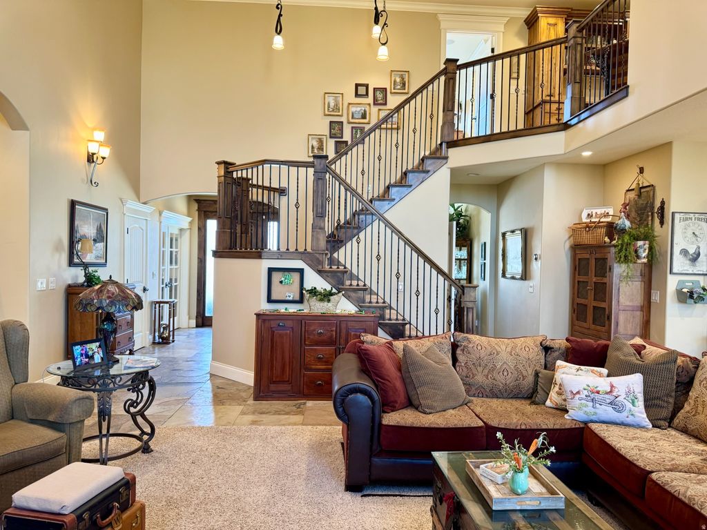 Experience elevated living in this stunning Bluffdale estate, where luxury, comfort, and space come together in perfect harmony. Set on over an acre of pristine land, this remarkable property offers privacy, versatility, and the rare opportunity for equestrian use with ample room for horses, additional structures, or a custom outdoor retreat. Inside, the home showcases a thoughtfully designed layout with 6 spacious bedrooms and 5 beautifully appointed bathrooms, providing both functionality and elegance for everyday living and entertaining. At the heart of the home is a stunning kitchen, designed to impress with its upscale finishes, generous workspace, and seamless flow into the main living areas perfect for hosting or enjoying quiet nights in. A cozy fireplace anchors the main living space, adding warmth and inviting ambiance. The recently finished walk-out basement is a true showpiece, featuring soaring 12-foot ceilings that create a bright, expansive environment rarely found in lower levels, along with a custom wine cellar that adds a refined, luxurious touch.Every detail has been curated for comfort and convenience, including permanent LED EverLights that enhance the home's exterior with year-round ambiance and effortless holiday lighting. Step outside to your private backyard retreat, complete with a large deck and water feature, a 10-foot fence surrounds the entire property for exceptional privacy. Enjoy the wide-open space, breathtaking surroundings, and peaceful atmosphere that only a property of this size can offer. Whether you're entertaining, relaxing, or embracing a more open lifestyle, this estate delivers an unmatched living experience. A rare blend of luxury finishes, modern amenities, and expansive land-this Bluffdale property is truly one-of-a-kind.