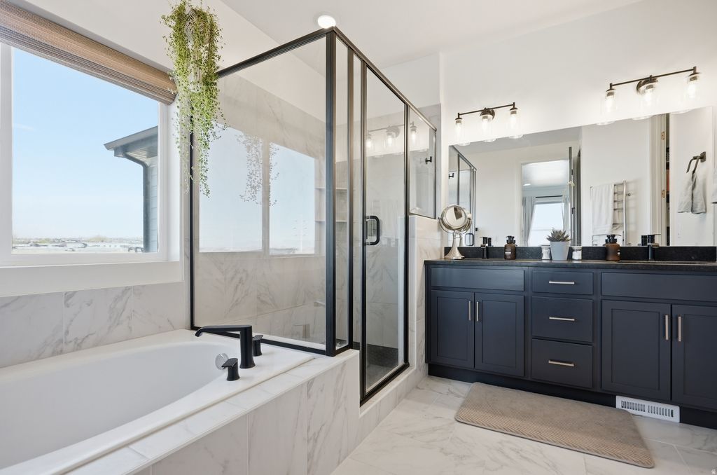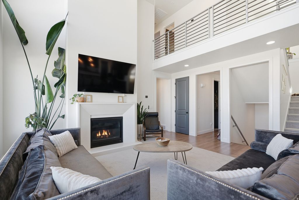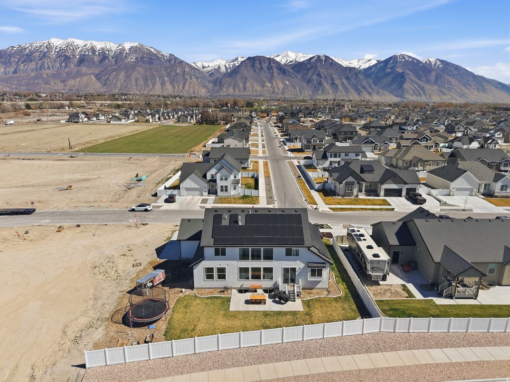 Situated in the highly desirable Broadview Shores community, this 2024-built modern farmhouse offers a rare combination of luxury, efficiency, and lifestyle. Set on a spacious .24-acre lot, this thoughtfully designed two-story home features a striking stone exterior, inviting covered front porch, and a 3-car garage with RV parking. Inside, you'll find a bright and open floor plan enhanced by 9-foot ceilings, 6 large bay windows, and abundant natural light. The living room showcases soaring ceilings, a cozy gas log fireplace, and a seamless connection to the gourmet kitchen-complete with quartz countertops, stainless steel appliances, dual wall ovens, gas counter top range, and a large island designed for both everyday living and entertaining. The main level features durable LVP and tile flooring, while plush carpet adds comfort to the living spaces. The spacious primary suite is a true retreat, offering a walk-in closet and a luxurious en suite bath with separate tub and shower, plus dual vanities. Upstairs, enjoy an oversized loft, two additional bedrooms, and a full bathroom, all accented by modern metal railing details. Step outside to take in breathtaking mountain views from the front and unforgettable sunsets over the lake from the backyard patio-an ideal setting to relax or entertain. The fully landscaped yard is partially fenced and ready for your personal touch. Additional highlights include $100K in fully paid solar panels, tankless water heater, EV charging setup, and all appliances included. Residents enjoy access to a brand-new clubhouse, pickleball courts, pool, and playground. A rare opportunity in a neighborhood where owners love to stay.***TO VIEW FULL MOTION VIDEO OF THIS HOME PRESS THE TOUR BUTTON*** Square footage figures are provided as a courtesy estimate only. Buyer is advised to obtain an independent measurement & verify all info.