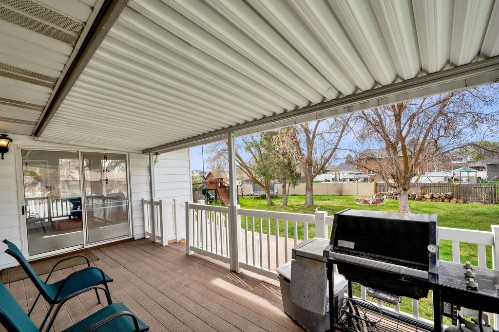 Beautiful Uintah Highlands 3,532 sq. ft. half acre lot, all flat yard! 6 Bedrooms 3 bath. Huge main floor primary suite with massive walk in closet. The 3rd bedroom on the main level, was converted into the primary suite's walk in closet. If a 3rd bedroom on the main level is needed, it could be converted back to a bedroom. 2 car garage, massive double trex decks, one covered. Newly remodeled kitchen including white shaker cabinets, granite counters and island bar, farm sink, laminate LVP flooring, stainless steel appliances. Includes fridge, stove, oven, 2 dishwashers. Brand new driveway, front walk and RV parking. Daylight basement with entrance, potential mother-in-law apartment. White ship lap wall decor, crown molding, 2nd laundry, sunroom, can lights, huge family room, large living room and dining. Cement b-ball court, swing set/play house slide, shed, hot tub, fully fenced yard. Front of the home features all brick. Dead end street with no thru traffic. Primary suite grand bath includes free standing tub, double vanity sinks, sep/shower with tile surround and Euro glass door. Main floor office with built in library shelves and double closet, office main level can be used as 6th bedroom.