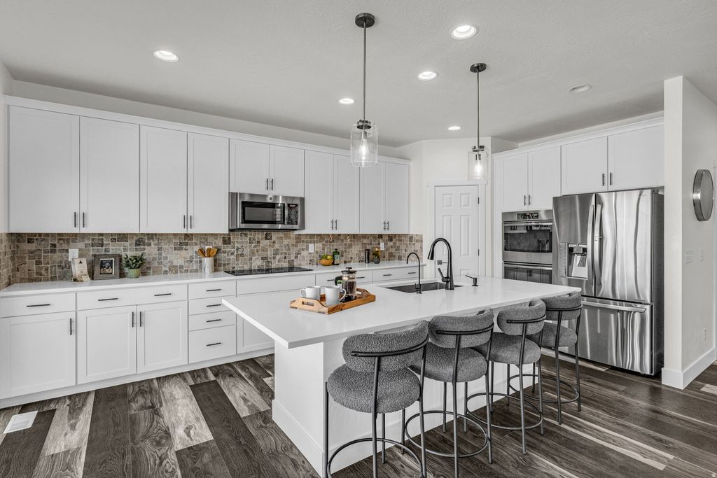 Clean, well-kept, and move-in ready with no backyard neighbors and great views. This home features a bright, open main floor with a spacious kitchen, dining, and living area that flows seamlessly together. The kitchen features white shaker-style cabinetry, a large island with plenty of seating, quartz countertops, stainless steel appliances, double ovens, and tile backsplash. Large sliding glass doors bring in tons of natural light and open directly to the elevated deck, perfect for relaxing or entertaining. Upstairs you'll find 3 bedrooms, 2 bathrooms, and a loft. The primary suite is spacious and comfortable, with a walk-in closet and en suite bathroom offering double vanities, a separate tub and shower, and plenty of natural light. The finished basement adds even more usable space with an additional bedroom, bathroom, living area, and flex space-ideal for a home office, workout room, or whatever fits your needs. Outside, the backyard is fully fenced with a patio, deck, designer landscaping, and open space behind, giving you extra privacy and unobstructed views. Located just minutes from Mountain View Village, the Real Salt Lake Training Center, and Mountain View Corridor, you've got quick access to shopping, dining, and commuting. This one checks off all the boxes. Come see it today!
