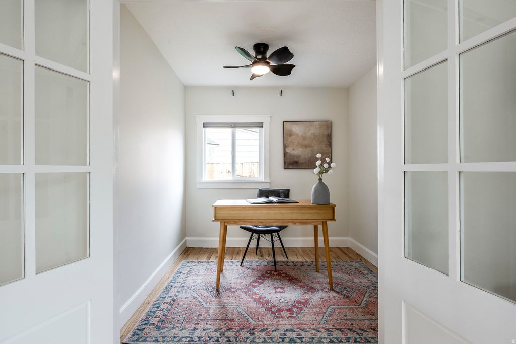 Nestled back off the street on a spacious lot in Sugar House, 1805 South 1900 East has been renovated inside and out. The curb appeal is a standout with a new front porch framed with stone, a newly painted exterior, chimney cap and landscaping. Step inside to an entry with ship lap & hooks and a stately living room with a newer gas fireplace insert, marble tile surround, and bookshelves to anchor the space. Stunning hardwood flooring extends through the main level, complemented by abundant natural light. The bright kitchen flows seamlessly into a spacious dining area with direct access to the back yard, making it perfect for everyday living and entertaining alike. The primary suite has a generous walk-in closet with Classy Closets built-in cabinetry and a professionally designed en-suite bathroom complete with white oak cabinetry, a zero-entry shower, quartz countertops and on-trend tile flooring. With another bedroom on the main floor and another full newly remodeled bathroom, plus a dedicated office on the main level, tucked behind elegant French doors, provides an ideal space for working from home. The lower level features a spacious family room, two additional bedrooms, a bathroom, and a dedicated laundry area. Updates can be found throughout, including brand new carpet, fresh paint, abundant built-in storage, new driveway in 2021, gate & fence 2023, water heater 2025, buried electrical line, and more. Outside, enjoy a spacious backyard with a wooden deck, covered patio with pergola with string lights and shade cover to enjoy the summer evenings, large lawn, and garden boxes. The oversized two-car garage has extra width, depth & height - a rare find in the area. Located in Sugar House, you are just minutes from shopping, restaurants, Sugar House park, and freeway access to the world-class canyons and the Salt Lake International Airport.