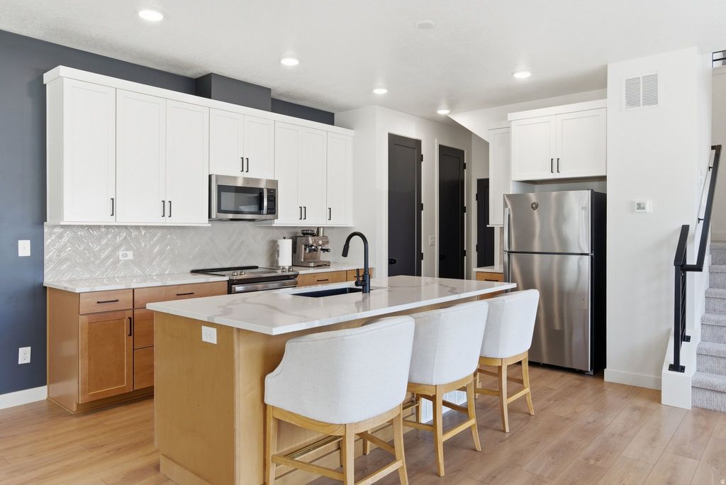 Almost $60k in builder upgrades! Corner lot gives larger yard space, patio for entertaining, lots of ample daylight, and great mountain views! Beautiful quartz countertops, two-tone shaker-style cabinets, low-maintenance Luxury Vinyl Plank floors throughout main floor, designer tile and carpet, sleek black iron railing, soft-close cabinet drawers, oversized master bedroom and spacious master bath and closet. Energy-efficient windows and 9-foot ceilings allow natural light to shine on the first and second levels. *Pre-wired to add your own designer pendant lighting over kitchen island, over nightstands in the primary bedroom, and over sinks in the master bath. Fenced, private yard with oversized patio. Yard is maintained by the HOA (inside and outside the fence) so you can enjoy your space without yard maintenance. Ridgeview is a brand new community in Highland, just south of Lone Peak High School! Quick access to the Murdock trail for miles of biking or walking/running! Just minutes from amazing recreation in American Fork Canyon (think biking, hiking, fishing, paddle boarding, snowshoeing, atv's), multiple golf courses, and parks. Square footage and all information to be verified by buyer. Call today for a private tour!