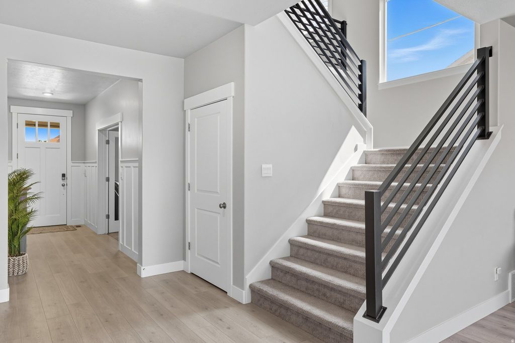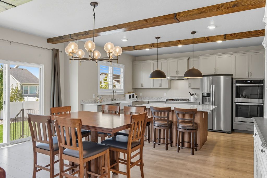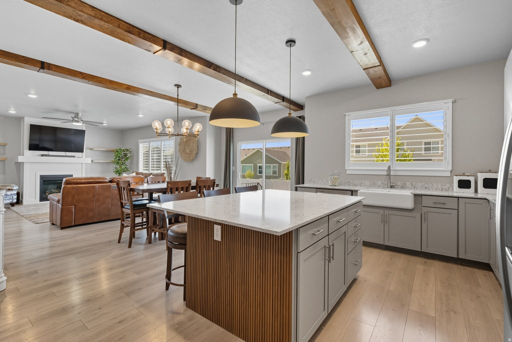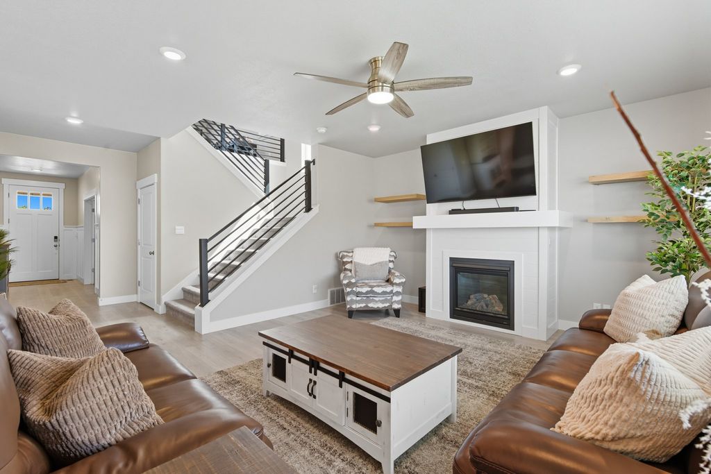 ***OPEN HOUSE - APRIL 11TH - 11-2 PM*** Like-new, move-in ready living awaits in Mapleton Grove! This beautifully upgraded 5-bedroom, 3.5-bathroom home in Mapleton, Utah offers 4,343 sq ft of thoughtfully designed living space in a highly desirable community. Blending modern finishes, functional design, and a prime location, this home is perfect for today's lifestyle. Inside, you'll find an open and inviting layout featuring plantation shutters, custom metal railings, upgraded lighting, and stunning wood beam accents. The spacious primary suite provides a private retreat with a large ensuite bathroom, while additional spaces include a den, loft, gym area, and multiple living rooms ideal for both everyday living and entertaining. The fully finished basement with a wet bar creates the perfect setting for gatherings, movie nights, or hosting guests. Step outside to a fully landscaped and fenced backyard offering privacy and room to relax or play. Rare features set this home apart, including a 3-car garage, RV parking for all your recreational vehicles and toys, and abundant storage including cold storage. Located in a quiet neighborhood with community pool access, this home is just minutes from shopping, dining, and I-15 for an easy commute. Enjoy nearby outdoor recreation including Hobble Creek Canyon, Mapleton Canyon, Spanish Oaks Golf Course, and local parks and trails. If you're searching for a move-in ready home in Mapleton with space, upgrades, and RV parking-this is the one. Schedule your private showing today! Square footage figures are provided as a courtesy estimate only and were obtained from County Records. Buyer is advised to obtain an independent measurement.