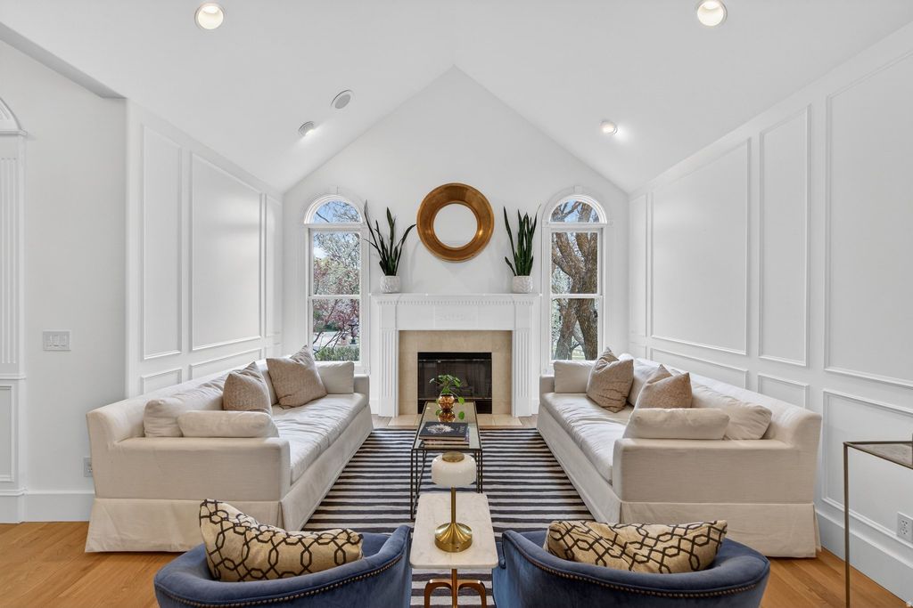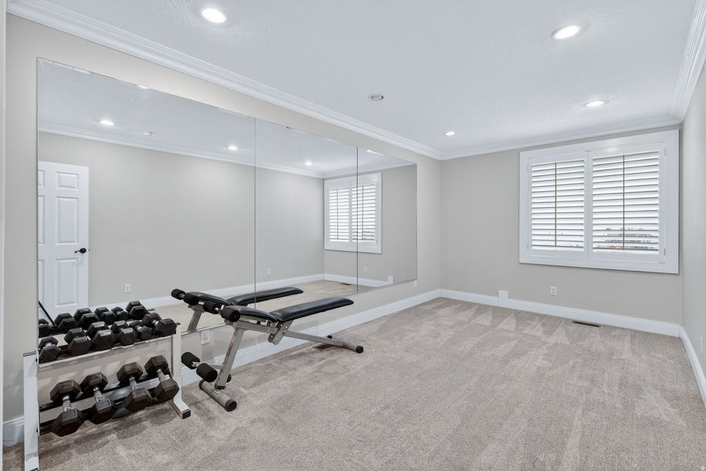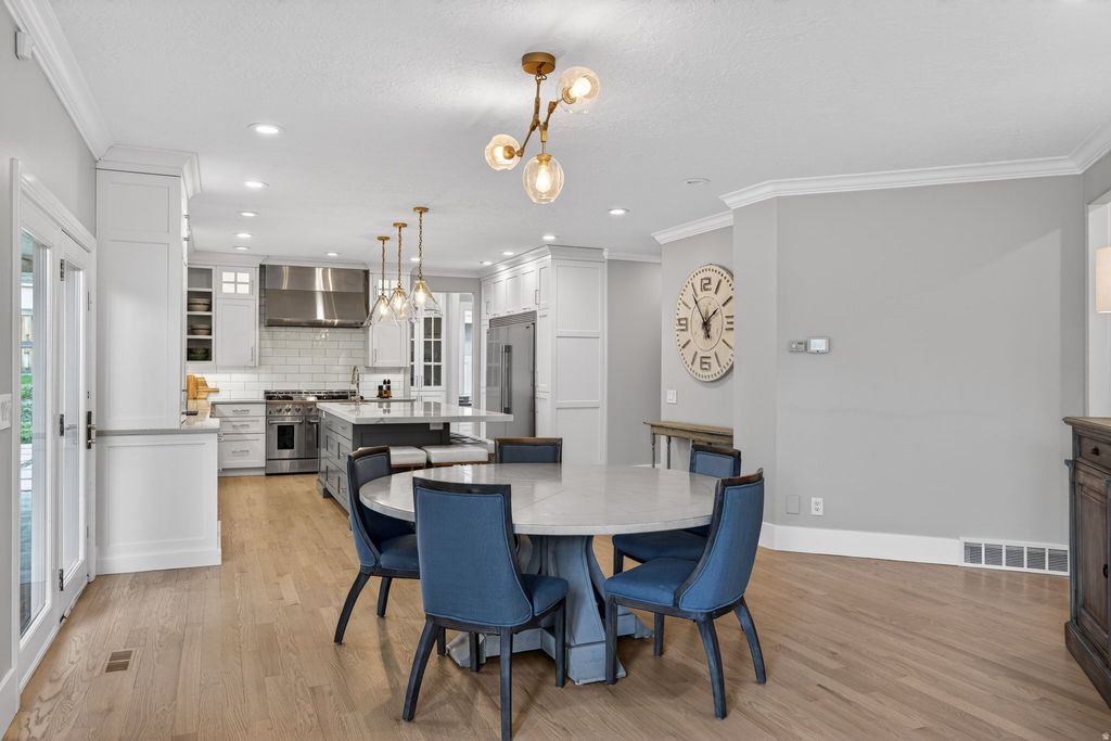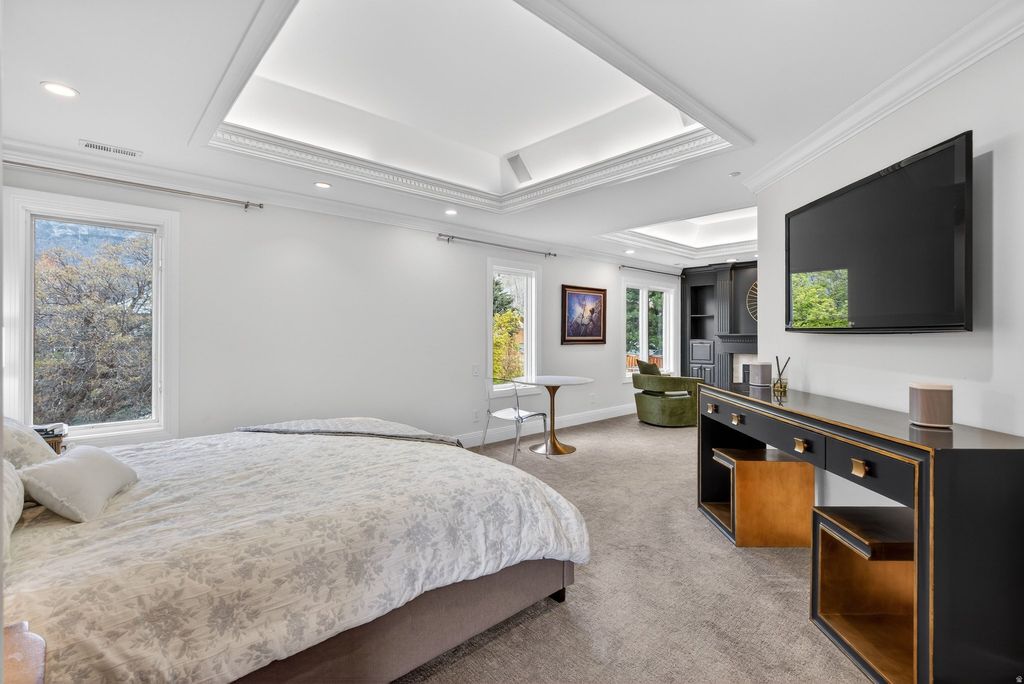 Incredible 6-bedroom, 5-bathroom custom family home with 5 fireplaces, located on a tree-lined street in Alpine's established east bench neighborhood. Bike and hiking trails connect directly to Lambert Park, and Creekside Park is just a short walk away. The backyard feels like a private park. A covered patio with ceiling fans overlooks a beautifully landscaped yard with mountain views, mature trees, an in-ground trampoline, full basketball court with Dominator adjustable standards, and a play set. The saltwater pool features a tanning shelf, basketball hoop, motorized cover, and UV filter for easy maintenance and all-day enjoyment. The recently remodeled main floor offers a stunning kitchen, ample pantry space, laundry room, and office area. Brand-new light oak hardwood floors create a bright, open flow throughout. Upstairs includes 4 spacious bedrooms, highlighted by a primary suite with fireplace, sitting area, two walk-in closets, and a bathroom with dual vanities, jetted tub, separate shower, and private WC. The basement includes 2 bedrooms, 2 bathrooms, a living area, reading nook, and rec room. It is plumbed and wired for a future kitchen and features a separate entrance from the garage-ideal for a mother-in-law apartment or independent living space. The oversized attached garage fits 3 vehicles comfortably and includes built-in cabinets and Rubbermaid hook rail storage throughout. An auxiliary garage opens to both the driveway and backyard, offering additional space for toys and gear.