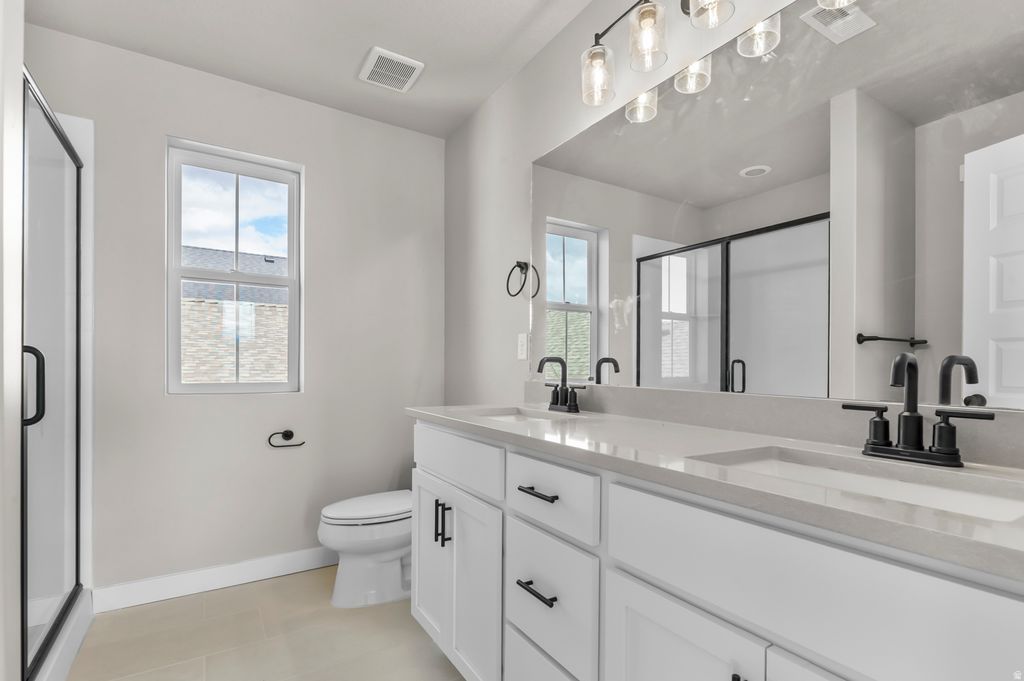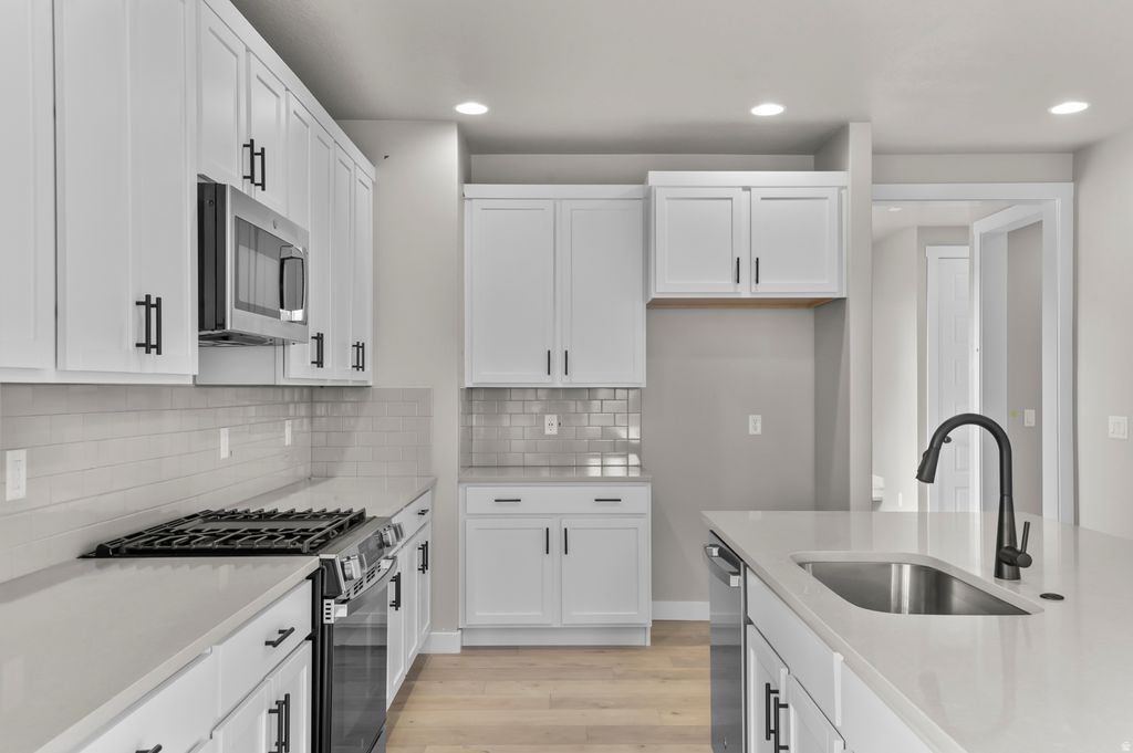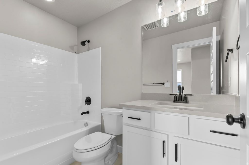 Great home in an amazing Daybreak community! This Colfax Victorian home offers timeless architecture enhanced with today's most desirable finishes. The kitchen showcases white laminate cabinets, quartz countertops, a tile backsplash, and platinum gas appliances, designed for both beauty and functionality. Throughout the home, you'll find a blend of laminate hardwood, tile, and carpet flooring, bringing both warmth and durability. Additional features include energy-efficient options, a tankless water heater, and Christmas light outlets for seasonal ease. Interior details highlight two-tone paint and Craftsman base & casing. The owner's bathroom is complete with cultured marble shower surrounds and sleek black matte hardware, creating a spa-like retreat. This home delivers the perfect balance of historic charm and modern convenience surrounded by amazing amenities!