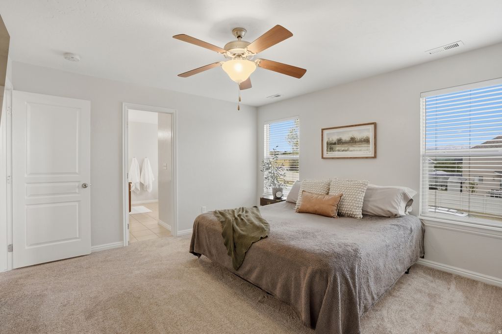 This beautifully updated, turn-key home in one of Saratoga Springs' most coveted neighborhoods, Harvest Hills, checks all the boxes. Step inside to find brand new carpet, fresh paint, and a bright, inviting layout featuring 3 bedrooms and 2.5 bathrooms. The spacious primary suite offers your own private retreat with double sinks, a relaxing garden tub, separate shower, and a large walk-in closet. You'll love the extra-large laundry room (washer & dryer included) with plenty of space for storage and folding-because convenience matters. The heart of the home? A beautiful kitchen with stainless steel appliances (yes, the refrigerator stays!) that opens to comfortable living spaces perfect for gathering and making memories. Outside, enjoy a fully fenced, private backyard on a large corner lot-complete with mature trees and peaceful views. And there's more: Unfinished basement ready to grow with you-add a bedroom, bathroom, and family room, Water softener included, 2 car garage, close to shopping, schools, parks and Mountain View Corridor. This home offers the space, comfort, and potential you've been waiting for-all in a location you'll love.
