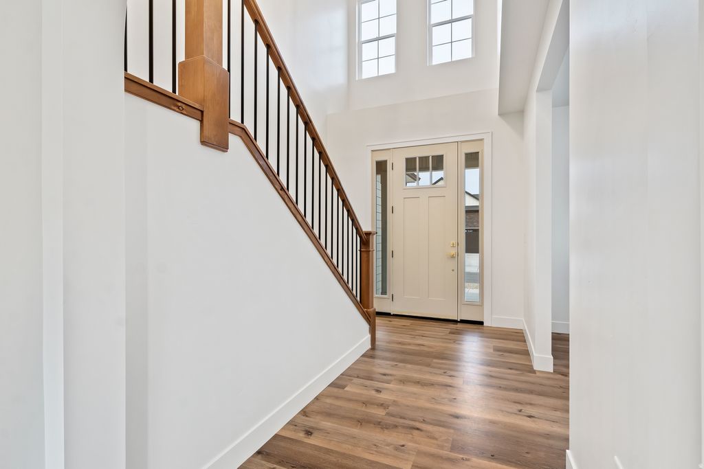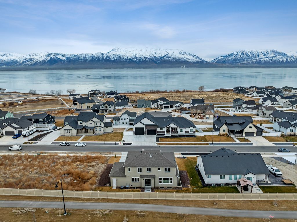 Nestled between the Oquirrh Mountains and Utah Lake, this pristine home boasts panoramic mountain views and an unbeatable location just minutes from TalonsCove Golf Course and the Saratoga Springs Marina. The double-arched doorway warmly invites guests in. Walk through the open-concept great room to discover a large kitchen with a walk-in pantry, high-end cabinets, stunning counter-to-ceiling tile, upgraded stainless steel appliances including a gas range with a custom range hood-so new that the stickers are still attached. This spacious layout is perfect for entertaining, with an abundance of natural light and charming built-in features throughout. Upstairs, every bedroom window frames a picturesque mountain view, and even the laundry room offers a peek at the mountains to the west. The private primary bedroom includes an en-suite bathroom with a custom floor-to-ceiling-tiled shower and a separate free-standing tub. Work comfortably from home in the dedicated office off the front door or transform to a formal living room or library, whichever suits you. Every day as you step out the front door, you're greeted by breathtaking views of Utah Lake and Mount Timpanogos. The unfinished basement, complete with a separate entrance, provides an opportunity to make it what you wish: a future mother-in-law suite or additional living space and second kitchen where you can directly access the outdoors from the lower level. With plenty of room for storage or adventure, this home comes with a three-car garage and a side yard large enough to accommodate a recreational vehicle. Come home to this luxury neighborhood in burgeoning Saratoga Springs.