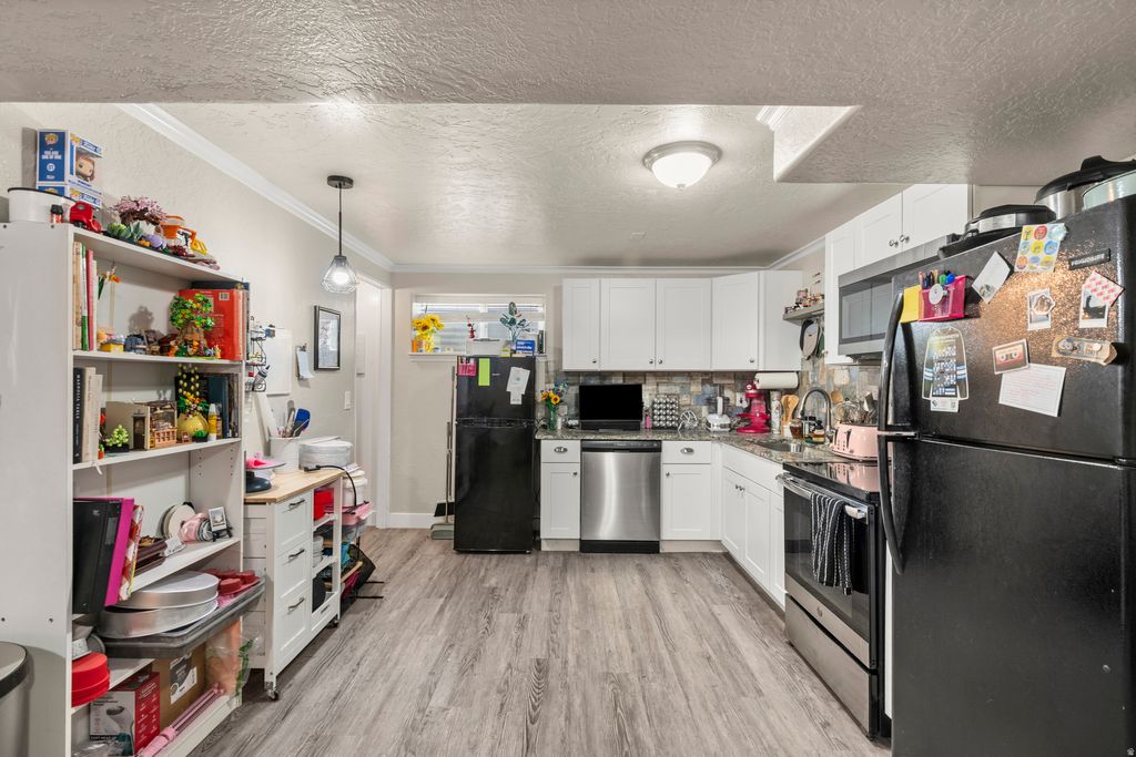 Multi-generational living + serious income potential in the heart of American Fork! Ideal for owner-occupants or investors-live in one unit and offset your mortgage. Income Snapshot: Upstairs rents for $1,575 + $275 utilities Downstairs rents for $1,300 + $250 utilities (low rent- prior rents $1400+|Gross RENTS= $3400 (Not including bonus garage) Bonus: HUGE Detached Workshop/garage previously both small light industrial and lighting. Rented low $500+/month-(family discount). Get additional income well over $4000l! Upstairs features 3 bedrooms, 1 bath, triple hall closets, dedicated laundry, and front/deck porch access. Downstairs (South Red Door) offers a fully functional separate basement/entrance Apartment- or Mother-In-Law; second living space with LVP flooring, granite countertops, San Juan backsplash, 2 bedrooms + office (non-conforming), 1 bath, under-stair storage, and its own spacious laundry/storage area. All kitchen appliances included throughout ENTIRE home (Fridges, Stove, etc) TOY OWNERS-this is the one: Massive 1,026 sq ft detached garage, plus built in side double Workshop, Yes-potato cellar! Garage has dual entrances + new electric garage doors. WHAT!! RV Parking, with over 2,100 sq ft of concrete space, park double trailers, boats, container, toys-bring it all. Separate front and rear concrete parking for each unit adds flexibility and privacy+ street parking, if needed! Location hits every box-walking distance to Art Dye Park (trails, disc golf, pickleball, dog park), AF Amphitheater, plus quick access to shopping, AF Fitness, walk to AF High school, and quick commuter routes- CENTRALLY LOCATED! Live in one, rent the other-or maximize all income streams. This one truly checks ALL the boxes. Video tour this one https://media.chelwoodmedia.com/order/798a42d2-635c-4169-55f6-08de8e503110?branding=false