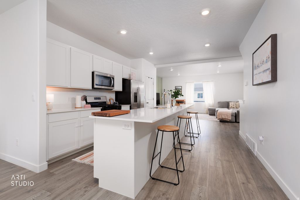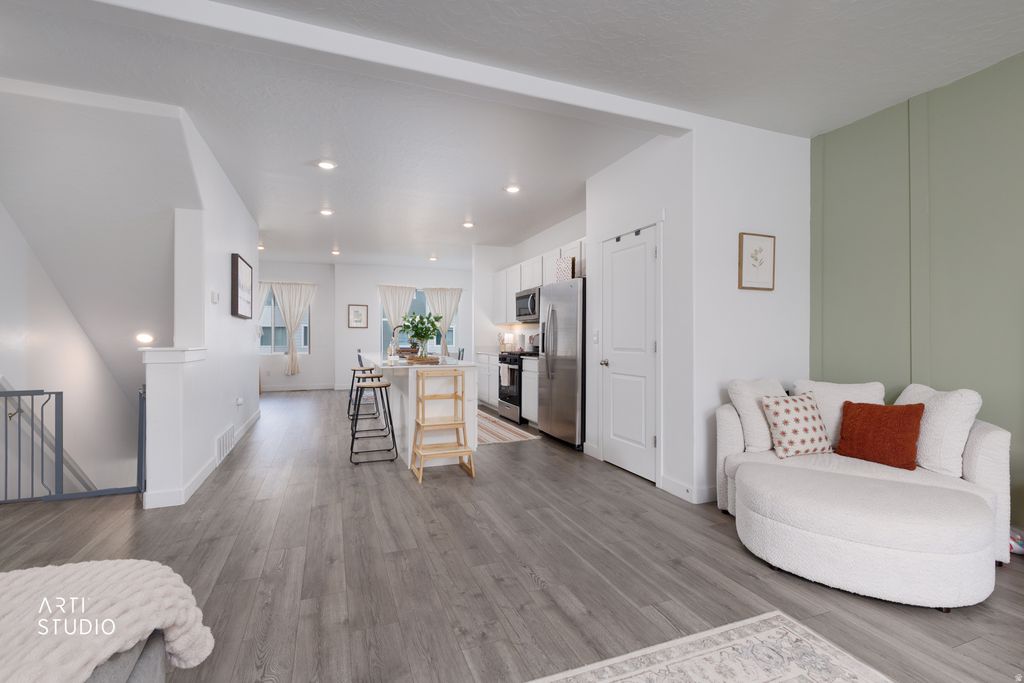 Welcome to this light and bright Saratoga Springs townhome, offering a thoughtful layout, beautiful upkeep, and a lifestyle you'll love. From the moment you step inside, you'll appreciate the open feel, natural light, and well-designed spaces that make this home both comfortable and functional. The main-level bedroom and bathroom provide incredible flexibility which is perfect for a home office, hosting guests, or even running a small home business. Upstairs, you'll find three additional bedrooms and two full bathrooms, creating the ideal setup for family living, guests, or additional workspace. This well-cared for unit also features a spacious 2-car garage and is located in a vibrant community with a pool, parks, and walking trails, offering plenty of opportunities to enjoy the outdoors and connect with neighbors. Conveniently located just minutes from shopping, dining, and great schools, and only 10 minutes from Silicon Slopes, this home offers the perfect balance of comfort, convenience, and community living. Clean, functional, and move-in ready makes this is a home you won't want to miss. Square footage figures are provided as a courtesy estimate only and were obtained from County records. Buyer is advised to obtain an independent measurement.