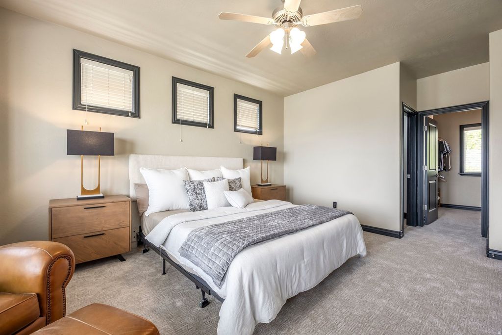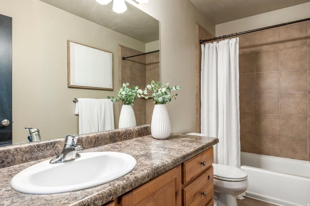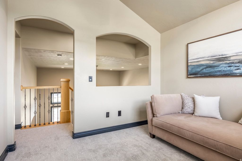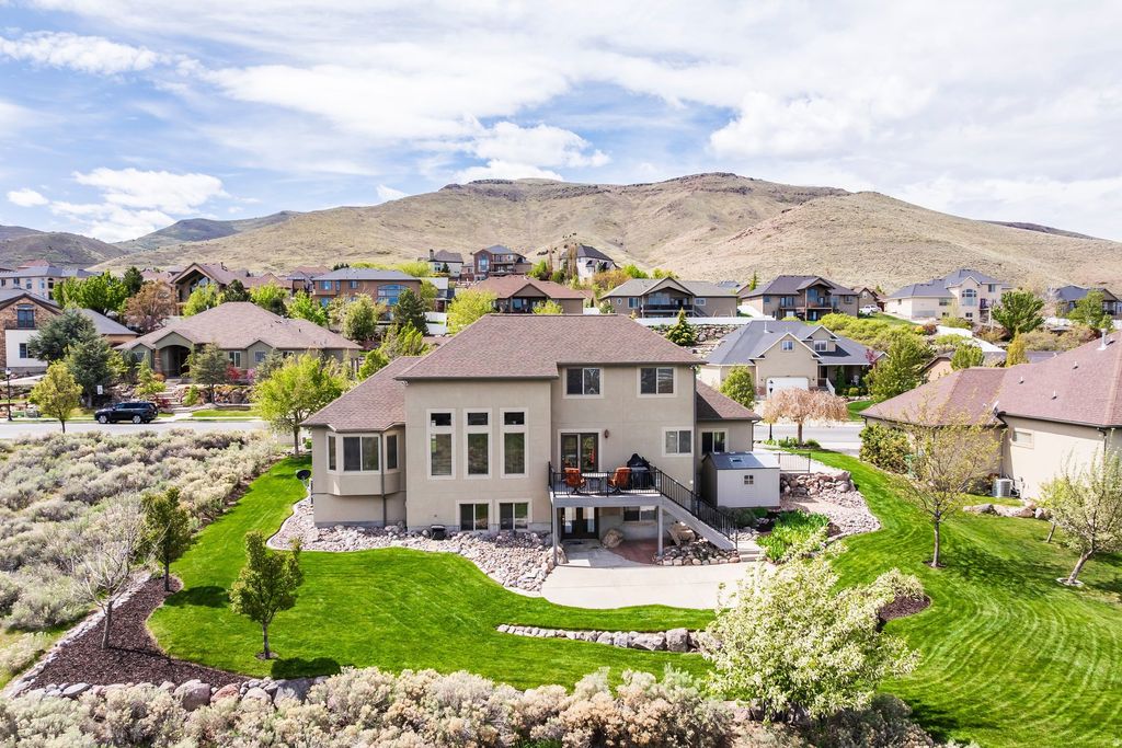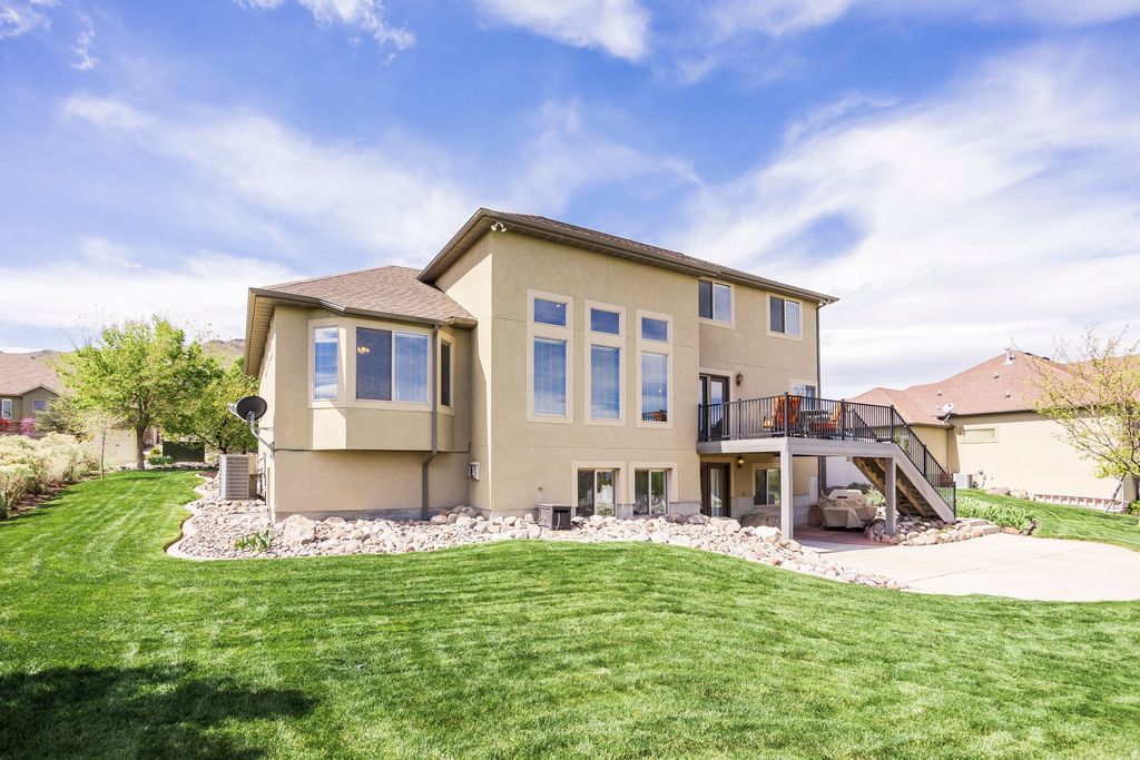 Welcome home to 5338 Emmeline Drive, where soaring vaulted ceilings and expansive windows create a light-filled interior, perfectly framing the sweeping mountain views. The main level is thoughtfully designed for both everyday living and entertaining, featuring an open-concept layout that seamlessly connects the living room, kitchen, and dining area. Step onto the deck to enjoy the morning sun or dining in the evening. The main-floor primary suite offers a private retreat, complete with a beautifully renovated bathroom with a walk-in shower and a separate soaking tub, plus a spacious walk-in closet. Upstairs you will find two additional bedrooms, a full bath, and a versatile loft providing flexible living space perfect for a home office, lounge, or creative studio. The walk-out lower level expands the home's possibilities with two additional bedrooms, a generous family room, semi-formal dining space, another laundry area and a kitchenette making it ideal for guests or multigenerational living. Additional features include a dedicated workout area and a cold storage room. Convenience meets luxury with main-level laundry and carefully curated upgrades throughout, including a reverse osmosis water system, new carpet and newly painted Martin garage doors. Additional highlights include RV parking, a utility sink in the garage, a new roof (2025), and HVAC system (2021). Outdoors, the property offers exceptional privacy with no neighbors on three sides. Enjoy a beautifully landscaped yard with a flagstone patio, lush lawn, perennial gardens with blooming irises, and a plum tree. Wildlife sightings, including deer, enhance the serene, natural setting. Located just half a block from Herriman's extensive trail network, this home offers immediate access to miles of hiking and mountain biking - bringing together luxury living and outdoor lifestyle in one exceptional property.