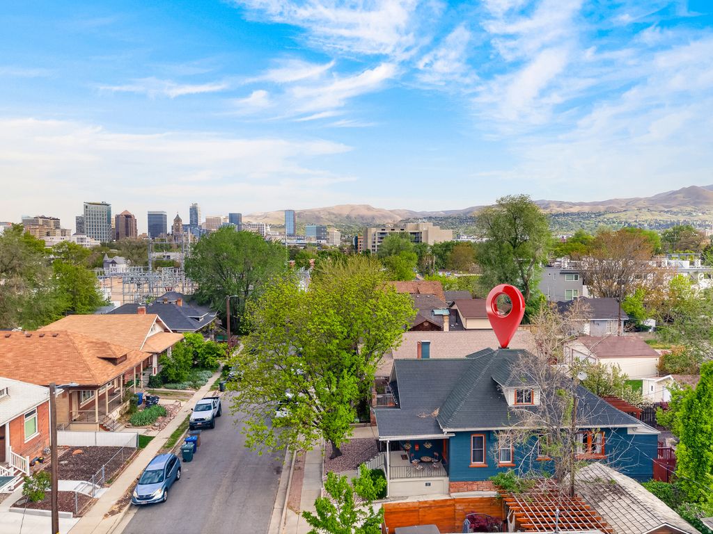 Tucked away on quiet Roberta Street, just a few blocks from Liberty Park and the vibrant shops and restaurants of 9th & 9th, this charming cottage offers an ideal blend of timeless character and modern updates. Thoughtfully remodeled, the home retains its historic appeal with features such as the original stained-glass front door, a grand fireplace, and beautifully preserved hardwood floors. The private primary suite occupies the second level and includes a recently updated en-suite bath. On the main floor, tall ceilings enhance a spacious living and dining area, complemented by two additional bedrooms and a full bath-one of which is generously sized and could easily serve as an alternative primary suite. Recent improvements include newer windows and blinds, updated lighting, a new furnace, A/C, water heater, and modern kitchen appliances. The basement, finished in 2024, adds a comfortable laundry area along with ample storage. Outdoors, a fully fenced backyard with mature trees, a fire pit, and stunning mountain views creates a perfect setting for relaxing or entertaining. The property also features a detached one-car garage, new concrete for off-street parking, fresh exterior paint, and a recently replaced roof. Every detail has been thoughtfully curated in this beautifully maintained home.