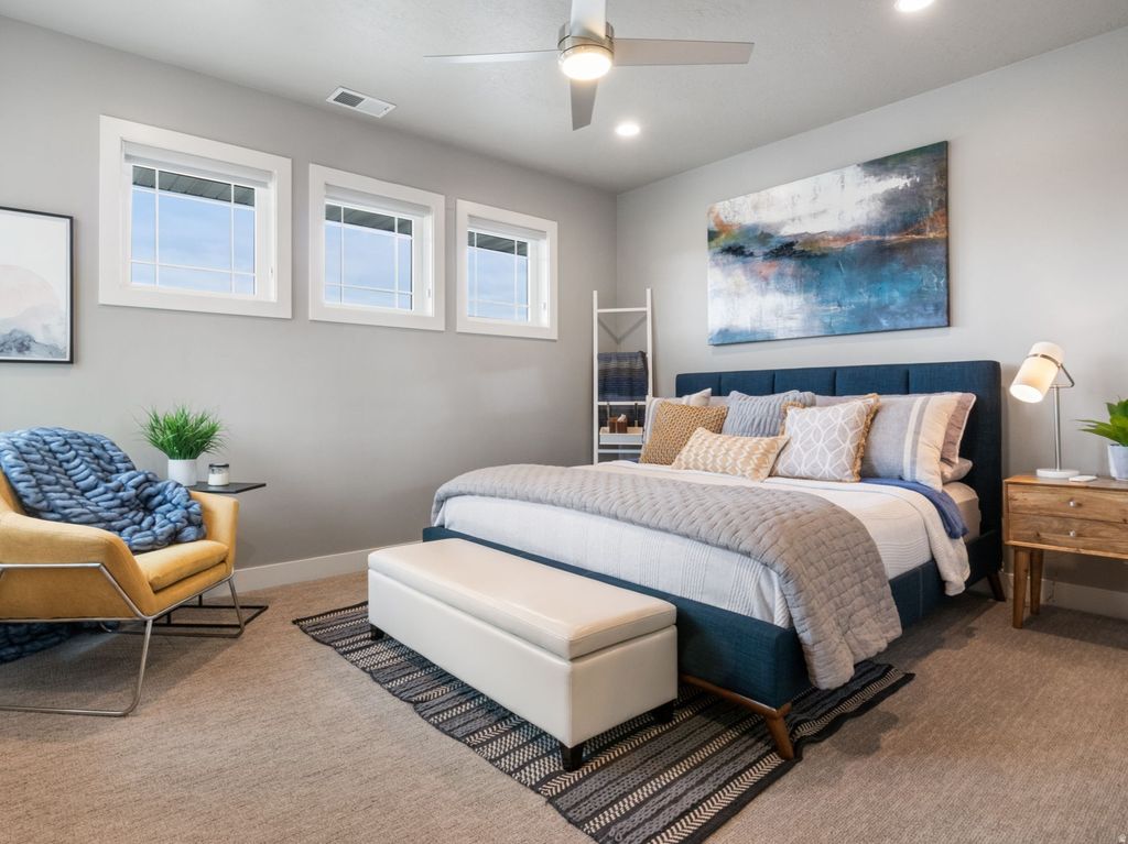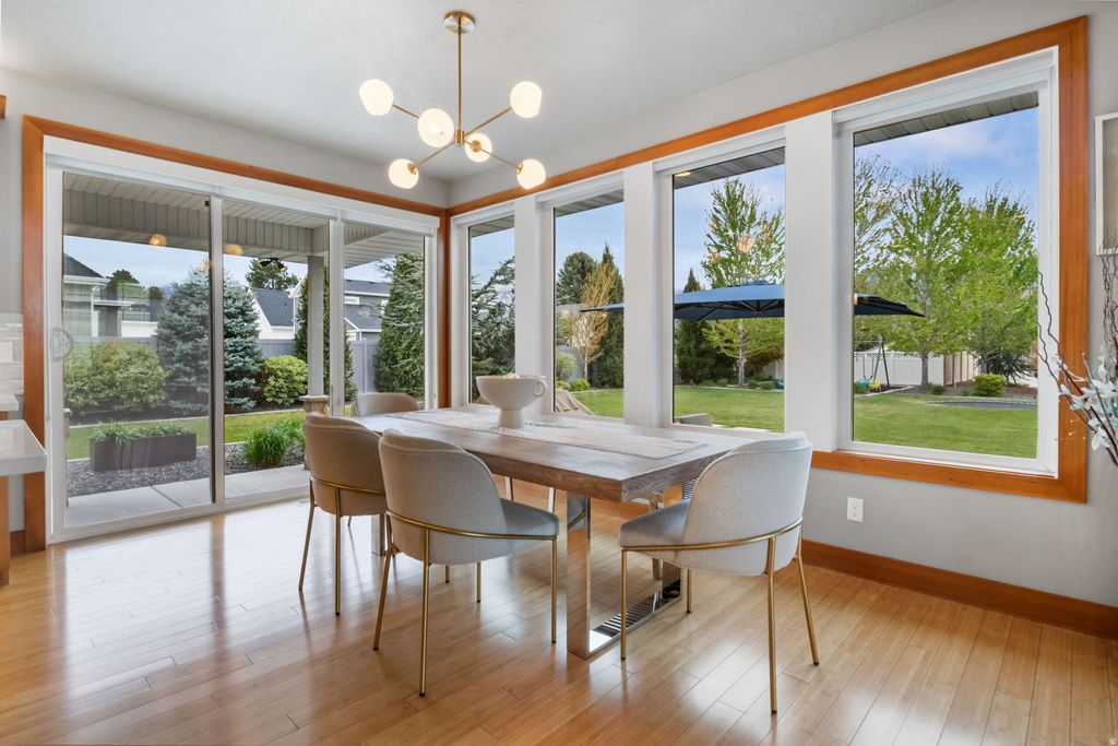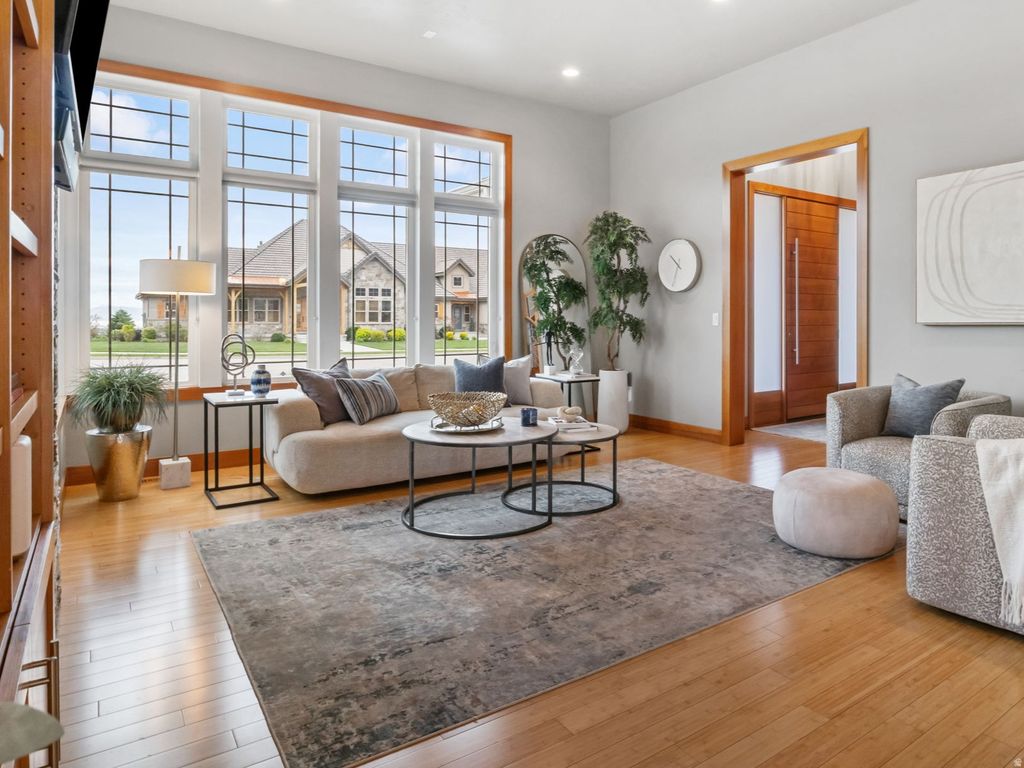 Located on a quiet cul-de-sac in Highland, this home sits on nearly half an acre with open views from every window. Vaulted entry with bamboo flooring and 8 ft doors throughout. Main level primary suite with spa-style bath, dual sinks, soaker tub, spacious shower, and walk-in closet. Gourmet kitchen with quartz countertops, custom cabinetry, walk-in pantry, and built-in workspace. Large laundry and mud area with lockers, bench, and coat hooks. Fully finished basement offers a family room, additional living space, bedroom, wet bar, gym or can be used as a 6th bedroom, and extensive storage. Walk out to a covered patio with professionally landscaped yard with fire pit. Clean, functional layout designed for comfort and luxury living.