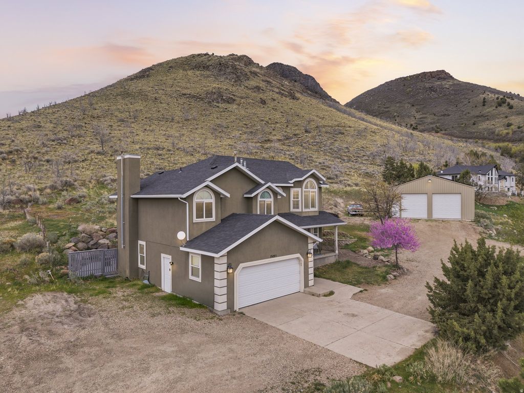 Perched on 2.6 acres, this stunning estate offers breathtaking panoramic valley & mountain views showcasing sunrises & sunsets from the back deck and front porch. The spacious home is complemented by an INCREDIBLE 6-CAR GARAGE/WORKSHOP, ideal for hobbies, storage, or business needs. Along with an ADDITIONAL ATTACHED 2 CAR GARAGE. Owners have loved the occasional wildlife sightings, deer etc. Workshop info (also pictured): 30X40', insulated metal roof and sides, 14' ceiling and 9" thick concrete floor. Adds 1200 sq ft not included in the sq ft listed. Shop has water, propane, hard plumbed for compressed air, 220V service & floor drain. Propane is 1000 gall tank. Pellet stove for additional heat in the winter. Includes LARGEST AMOUNT OF SOLAR PANELS ON A RESIDENTIAL SHOP WHEN INSTALLED to lower electric bills. Plus 20kWh of backup batteries on shop wall. 21 kWh solar system. Beautiful craftsmanship that has been well maintained & cared for. HIGH SPEED FIBER INTERNET LINES TO THE HOME. Other features include vaulted ceilings, walk-in closet, en suite bathroom, extra interior storage. Washer, dryer, refrigerator included. Buyer to verify all info.