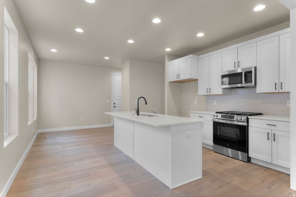 Brand new gorgeous Baxter Victorian in a great Daybreak community! This home blends classic style with modern convenience highlighting a modern kitchen that is beautifully designed with cotton maple cabinets, quartz countertops, a tile backsplash, and platinum gas appliances, creating the perfect space for cooking and entertaining. Flooring throughout includes a combination of laminate hardwood, tile, and carpet, providing both warmth and durability. This home comes equipped with energy-efficient options, a tankless water heater, and Christmas light outlets for added convenience. Interior details include two-tone paint and Craftsman base & casing for a refined finish. The owner's bathroom features cultured marble shower surrounds and black matte hardware, offering a touch of elegance and relaxation. This home offers the perfect balance of traditional character and modern upgrades for the pickiest buyers needs!